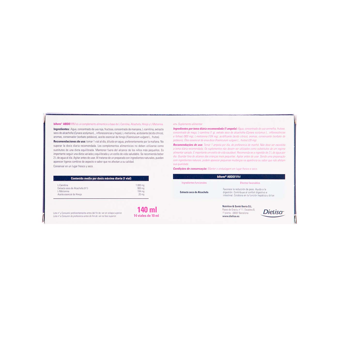 Abdofirm de Biform es un complemento alimenticio líquido en viales a base de L-carnitina, extracto seco de alcachofa, L-metionina y aceite esencial de hinojo.
