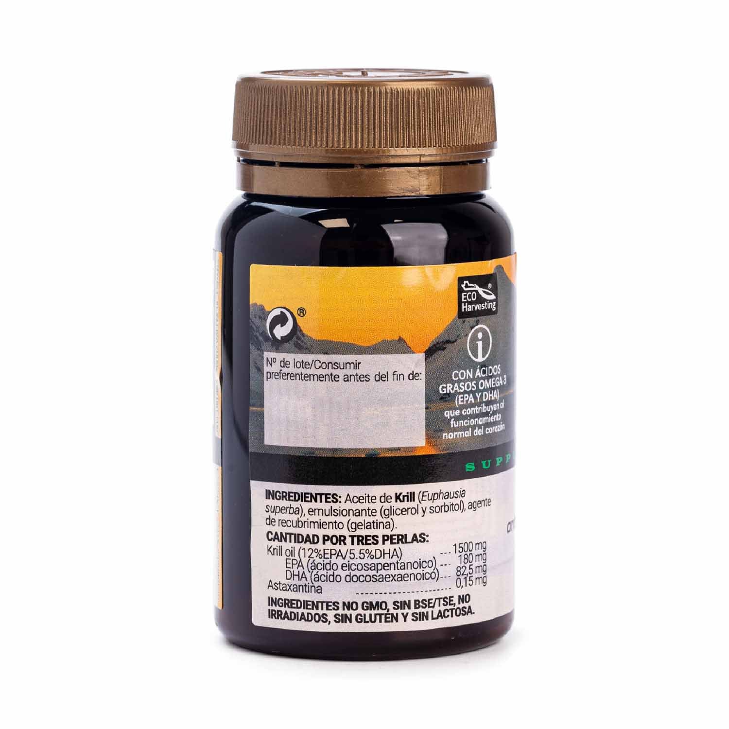 El krill (antartic euphausia superba) es un crustáceo que forma parte del plancton se alimenta de algas microscópicas. Contiene ácidos grasos Omega-3 (EPA y DHA) que contribuye al funcionamiento normal del corazón. Es un complemento alimenticio presentado en cápsulas.