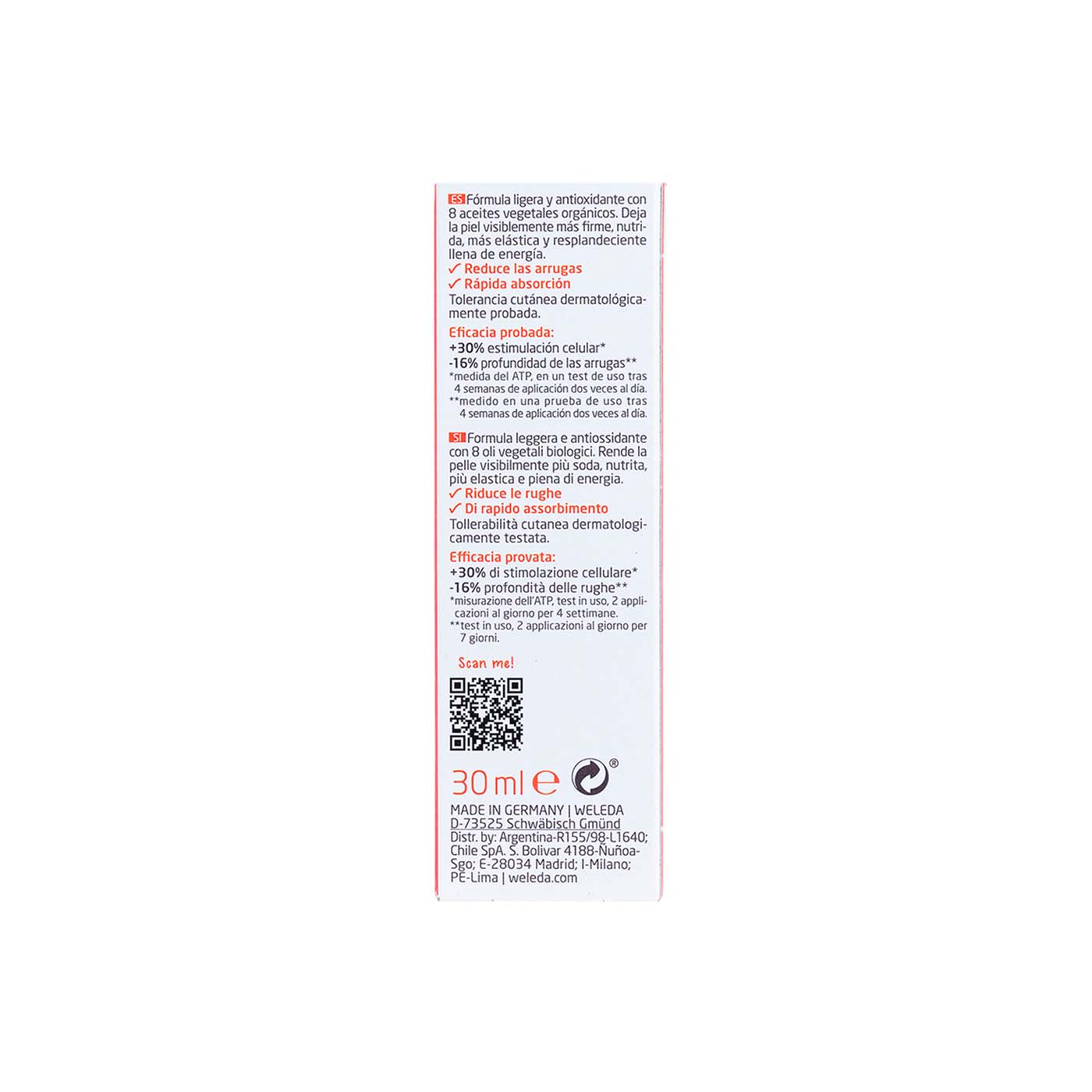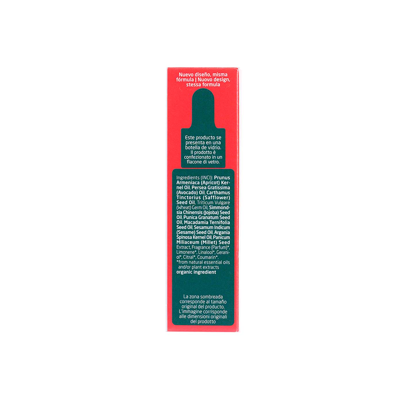 INCI: Prunus Armeniaca (Apricot) Kernel Oil, Persea gratissima (Avocado) Oil, Carthamus Tinctorius (Safflower) Seed Oil, Triticum Vulgare (Wheat) Germ Oil, Simmondsia Chinensis (Jojoba) Seed Oil, Punica Granatum Seed Oil, Macadamia Ternifolia Seed Oil, Sesamum Indicum (Sesame) Seed Oil, Argania Spinosa Kernel Oil, Panicum Miliaceum (Millet) Seed Extract, Fragrance (Parfum)*, Limonene*, Linalool*, Geraniol*, Citral*, Coumarin*. *De aceites esenciales naturales.