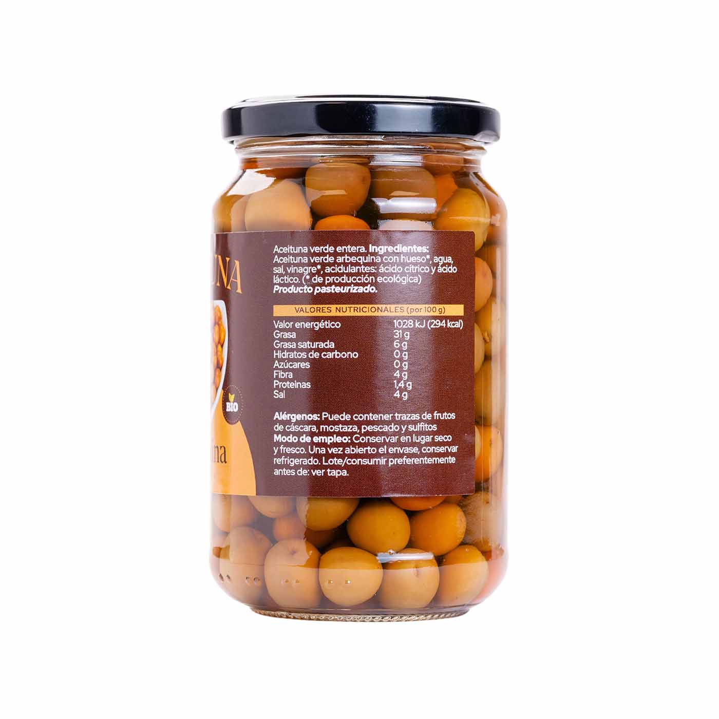 Aceituna verde arbequina con hueso*, agua, sal, vinagre*, acidulantes: acido cítrico y ácido láctico. * de producción ecológica.