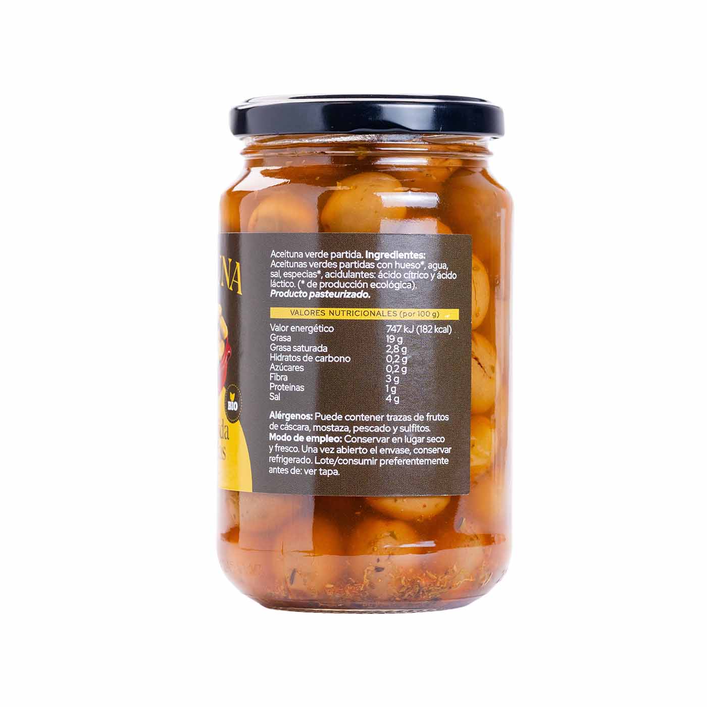 Aceitunas verdes partidas con hueso*, agua, sal, especias*, acidulantes: ácido cítrico y ácido láctico. * de producción ecológica.