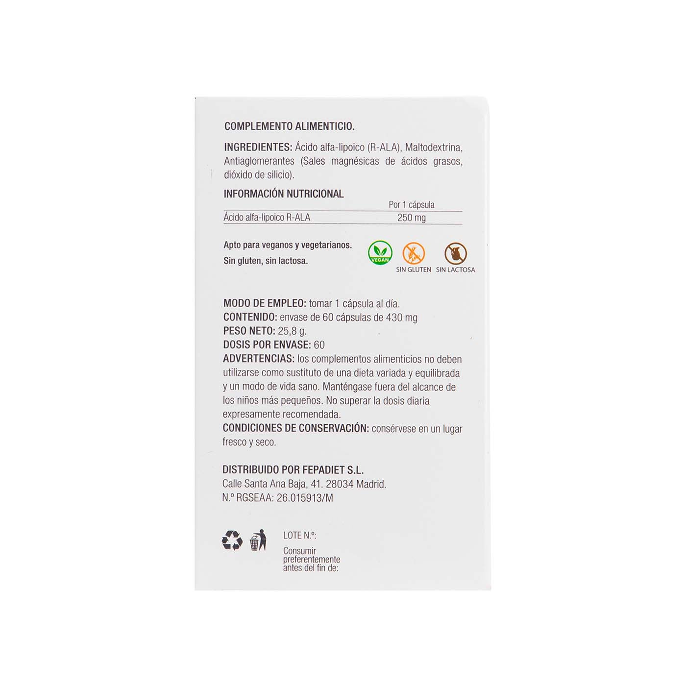 Nutrientes por 1 cápsula (dosis diaria): Acido Alfa-Lipoico 250mg.