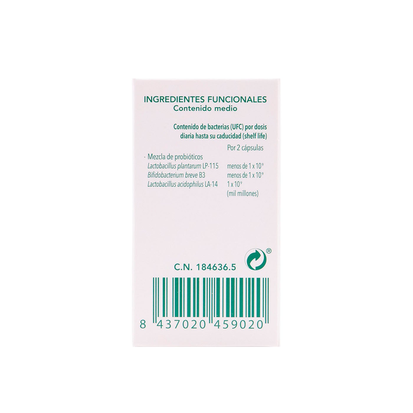 Maltodextrina de maíz, agente de carga: celulosa microcristalina, gelatina (cápsula), mezcla de fermentos lácteos (Lactobacillus plantarum LP115, Bifidobacterium breve B3, Lactobacillus acidophilus LA14), antiaglomerantes: sales de magnesio de los ácidos grasos, dióxido de silicio.