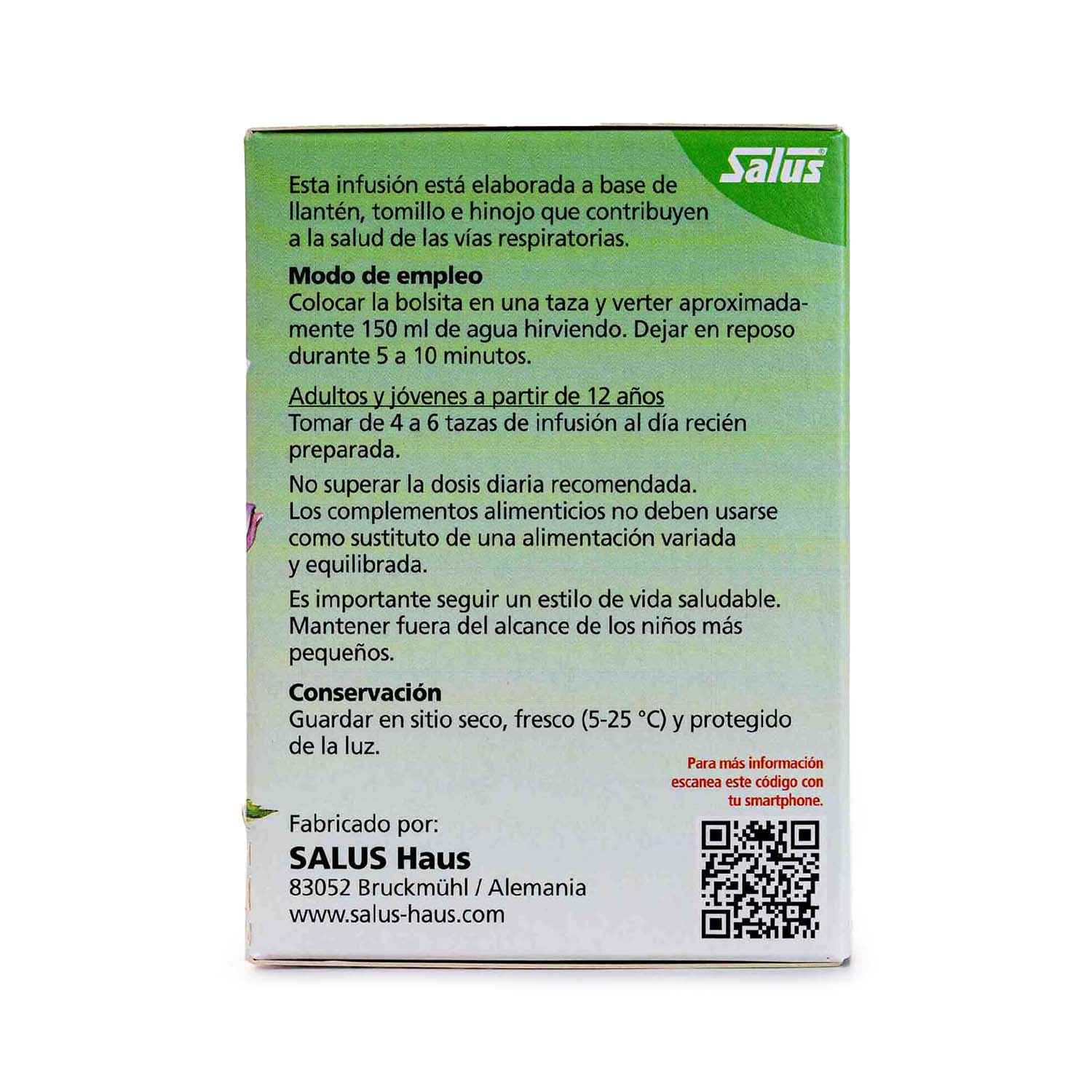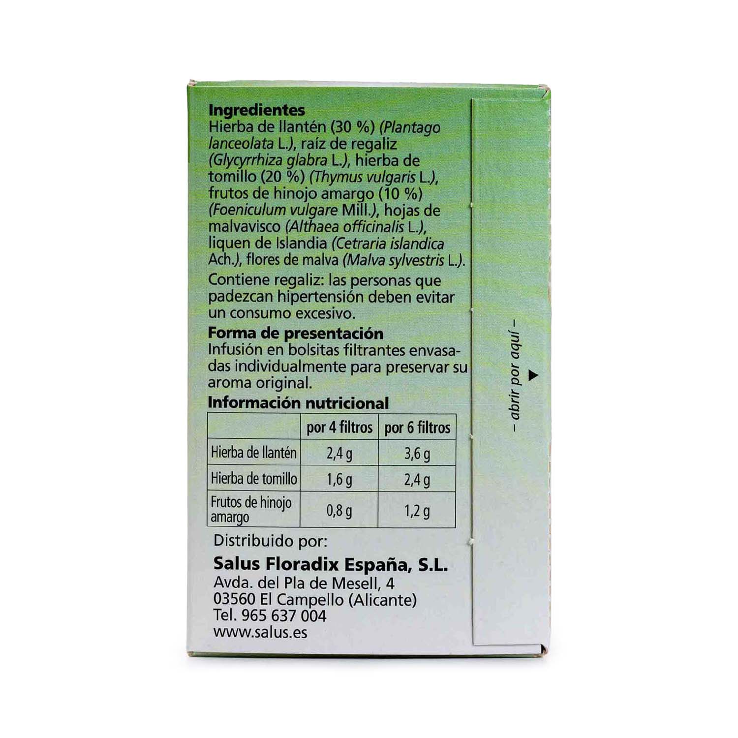 La infusión Alpenkraft de Salus está elaborada a base de llantén, tomillo, hinojo y liquen de Islandia que contribuyen a la salud de las vías respiratorias así como raíz de regaliz, malvavisco y malva.