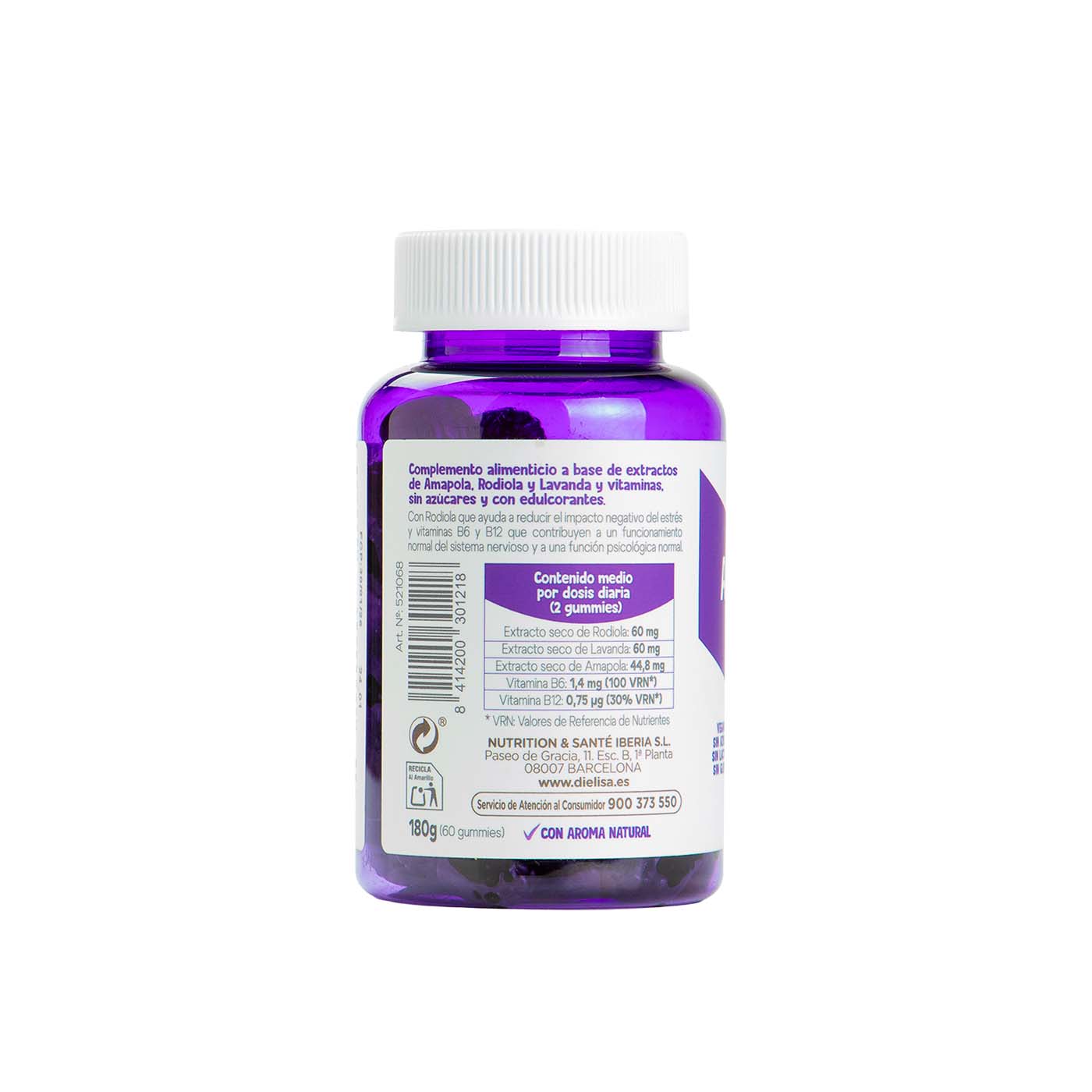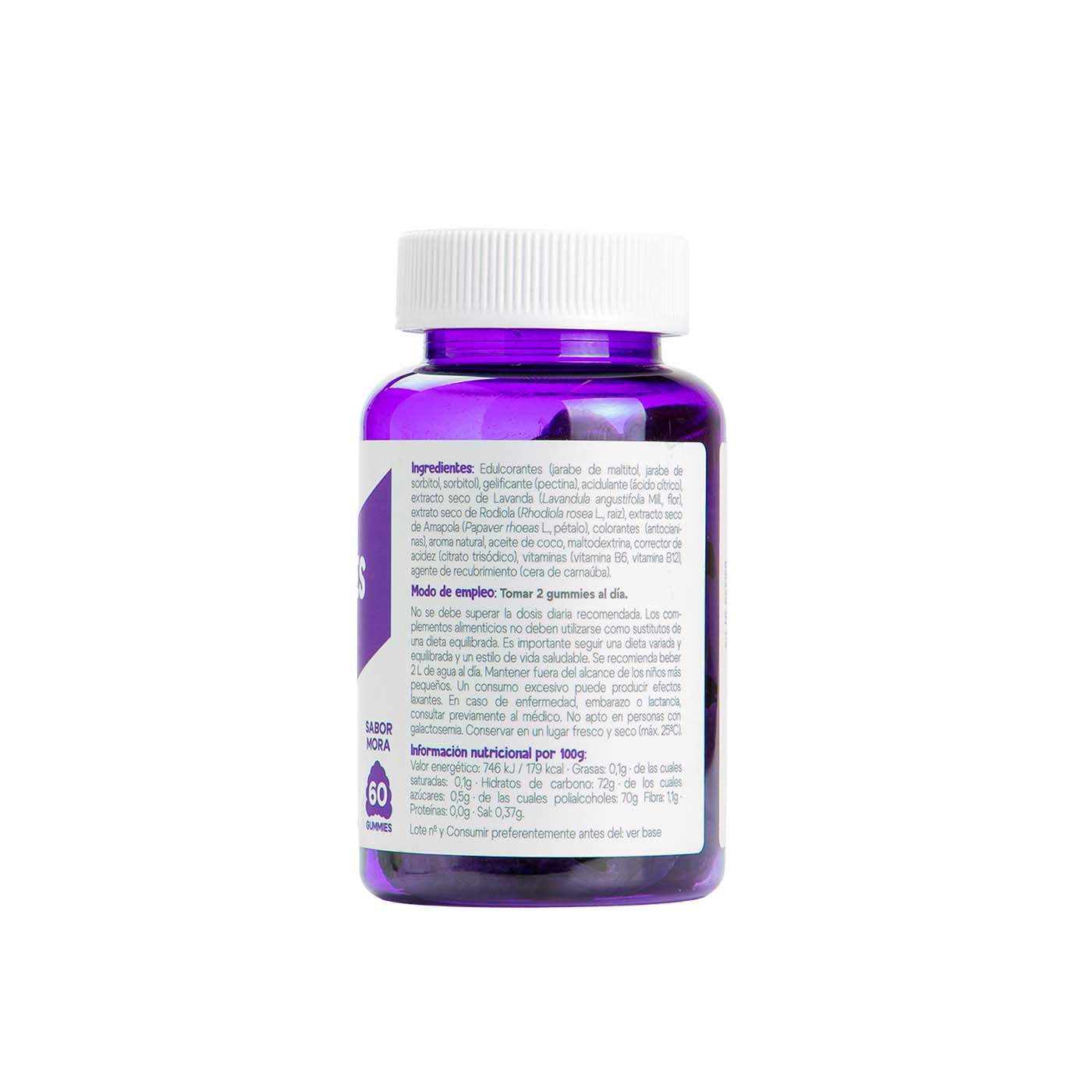 Ingredientes activos por dosis diaria (2 gummies): EXtracto deco de Rodiola 60mg, extracto seco de lavanda 60mg, extracto seco de Amapola 44,8mg, Vitamina B6 1,4mg (VRN 100%), Vitmina B12 0,75 μg (VRN 30%).
