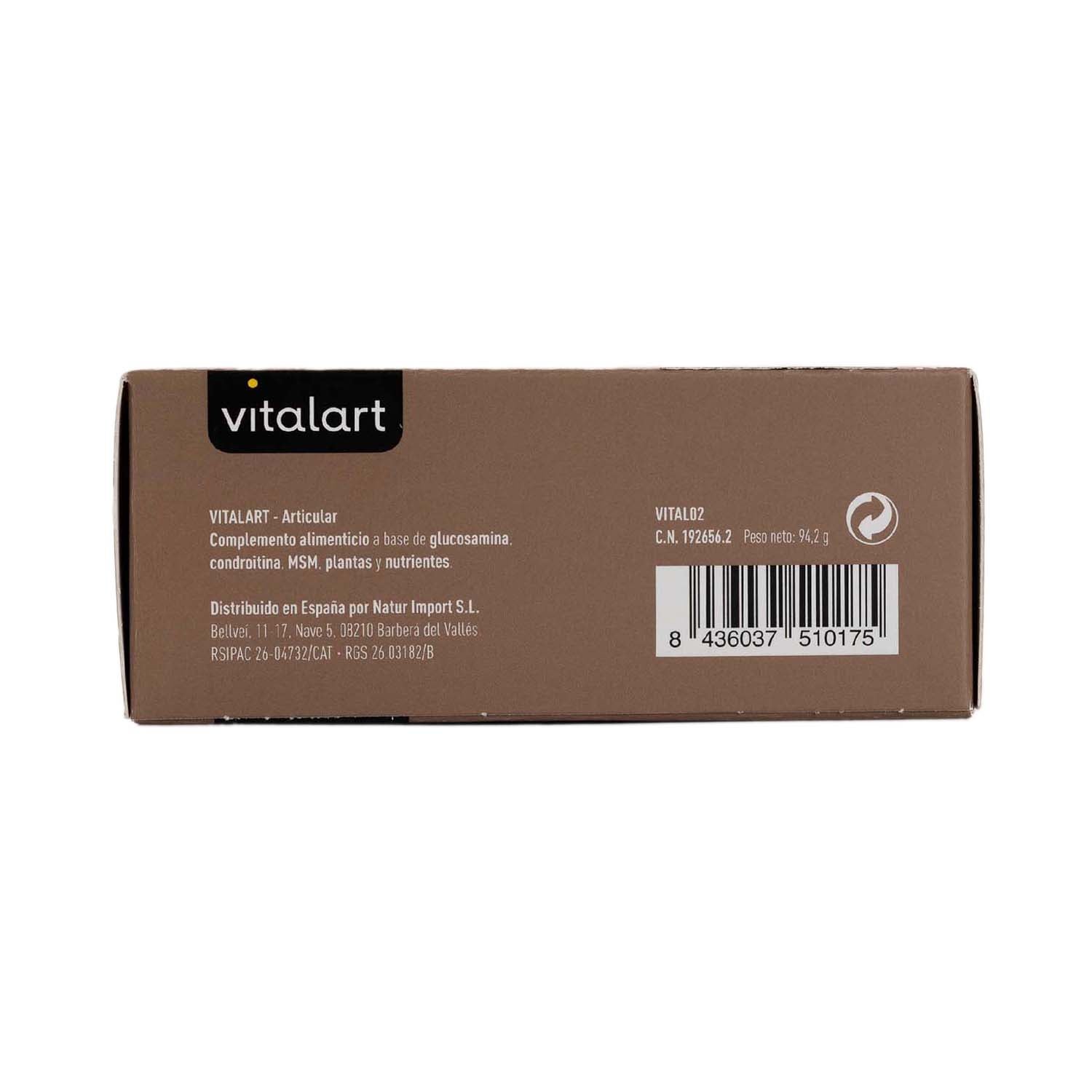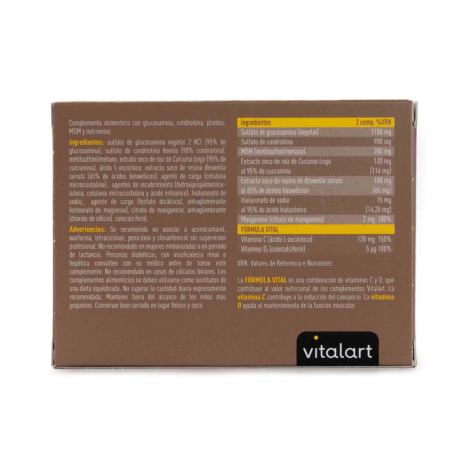 VITALART ARTICULAR resulta ideal para enriquecer la dieta de personas que quieren cuidar sus articulaciones al máximo. La glucosamina y la condroitina son elementos estructurales que forman parte de nuestras articulaciones. Con los años puede ser necesaria una complemento adicional junto a nutrientes específicos como el manganeso y las vitaminas C y D.