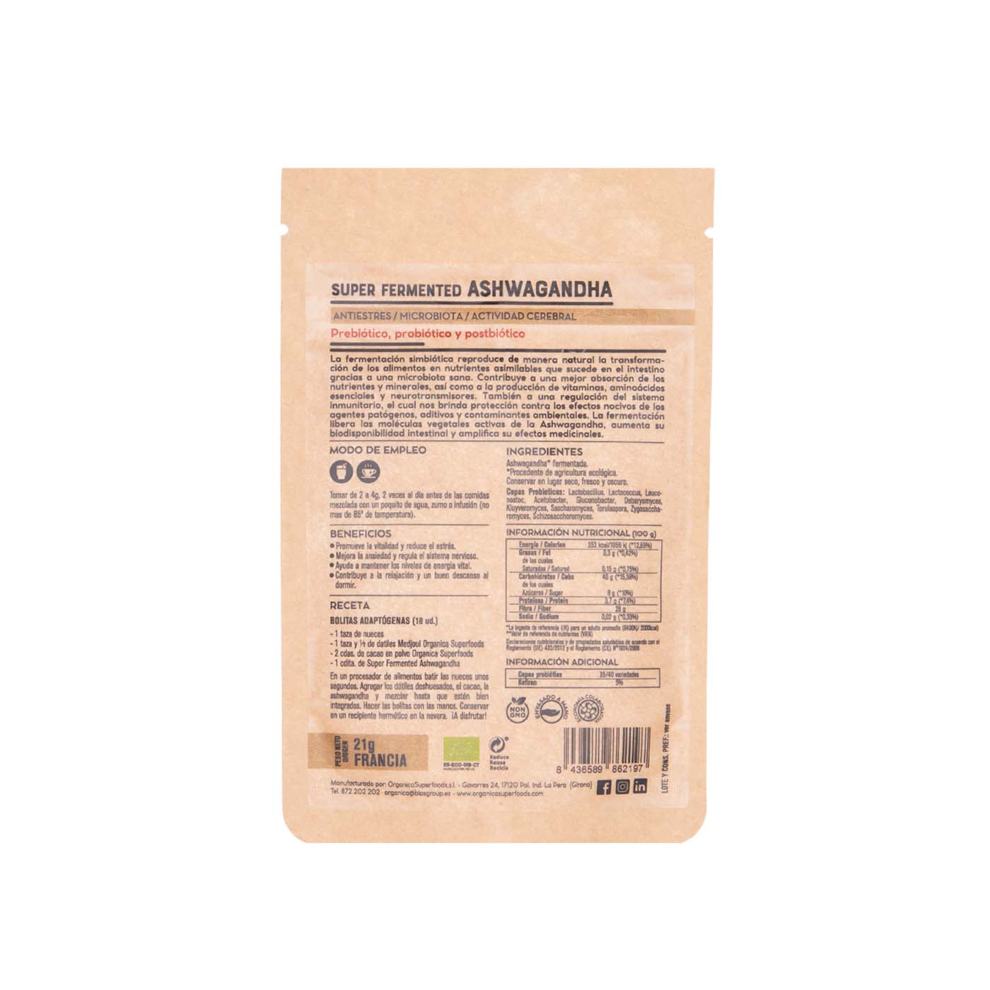 Ashwagandha fermentada procedente de agricultura ecológica.