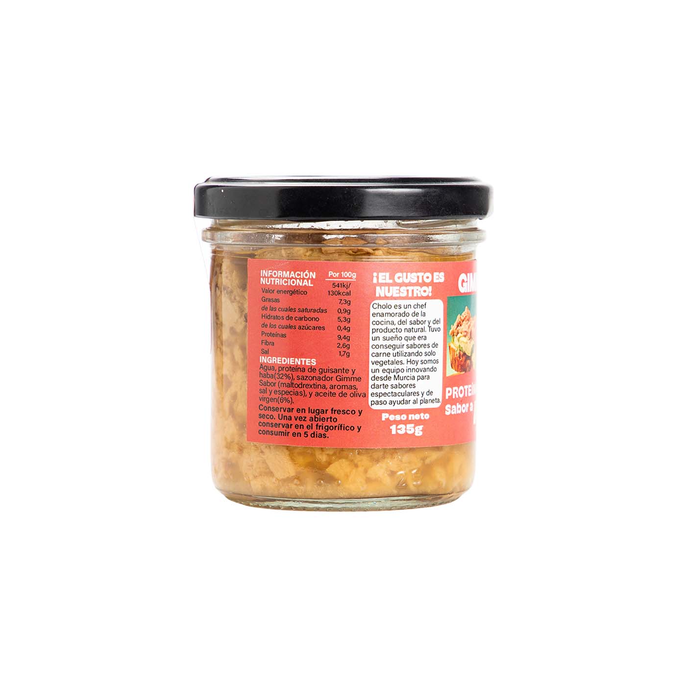 Agua, Proteína de Guisante y Haba (32%), Sazonador Gimme Sabor(Maltodextrina, aromas, sal y especias), Aceite de Oliva virgen(6%)