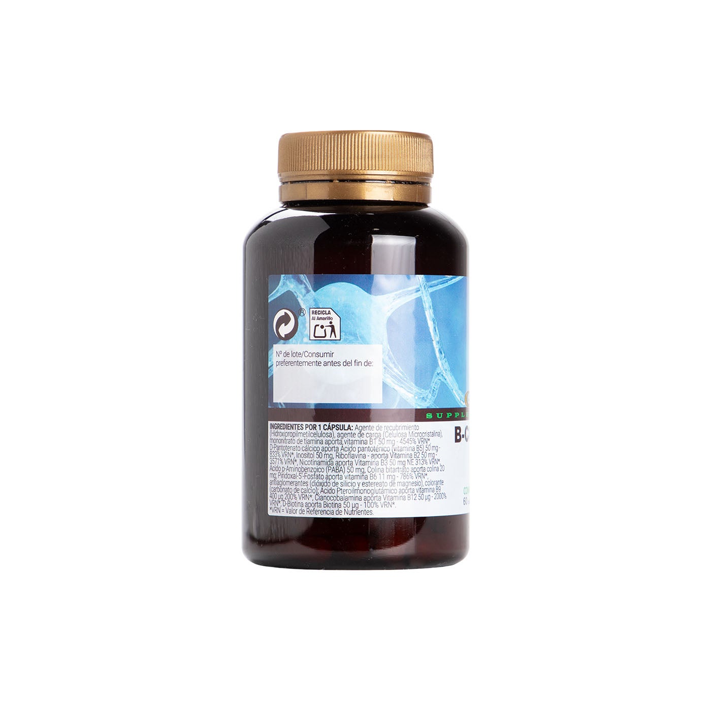 Ingredientes por 1 cápsula: Agente de recubrimiento (Hidroxipropilmeticelulosa), agente de carga (Celulosa Microcristalina), mononitrato de tiamina aporta vitamina BT 50 mg - 4545% VRN*, D-Pantotenato cálcico aporta Ácido pantoténico (vitamina B5) 50 mg - 833% VRN*, inositol 50 mg, Riboflavina - aporta Vitamina B2 50 mg - 3571% VRN*, Nicotinamida aporta Vitamina B3 50 mg NE 313% VRN*, Ácido p-Aminobenzcico (PABA) 50 mg, Colina Bitartrato aporta colina 20 mg, Pridoxal-5-Fosfato aporta vitamina B6 11 mg - 786% VRN*, antiaglomerantes (dióxido de silicio y estereato de magnesio), colorante (carbonato de calcio); Ácido Pteroilmonoglutámico aporta vitamina B9 400 µg 200% VRN*, Cianocobalamina aporta Vitamina B12 50 µg - 2000% VRN*, D-Biotina aporta Biotina 50 µg - 100% VRN.
