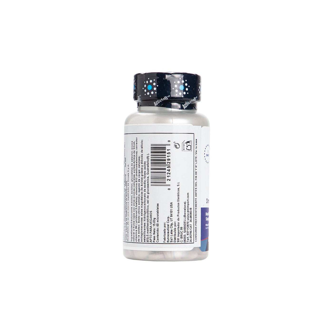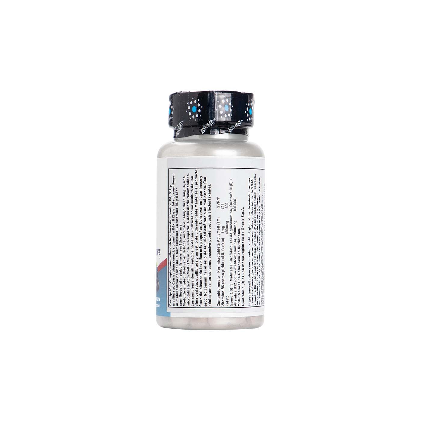 Complemento alimenticio a base de vitamina B6, B12 y metilfolato, con edulcorantes.