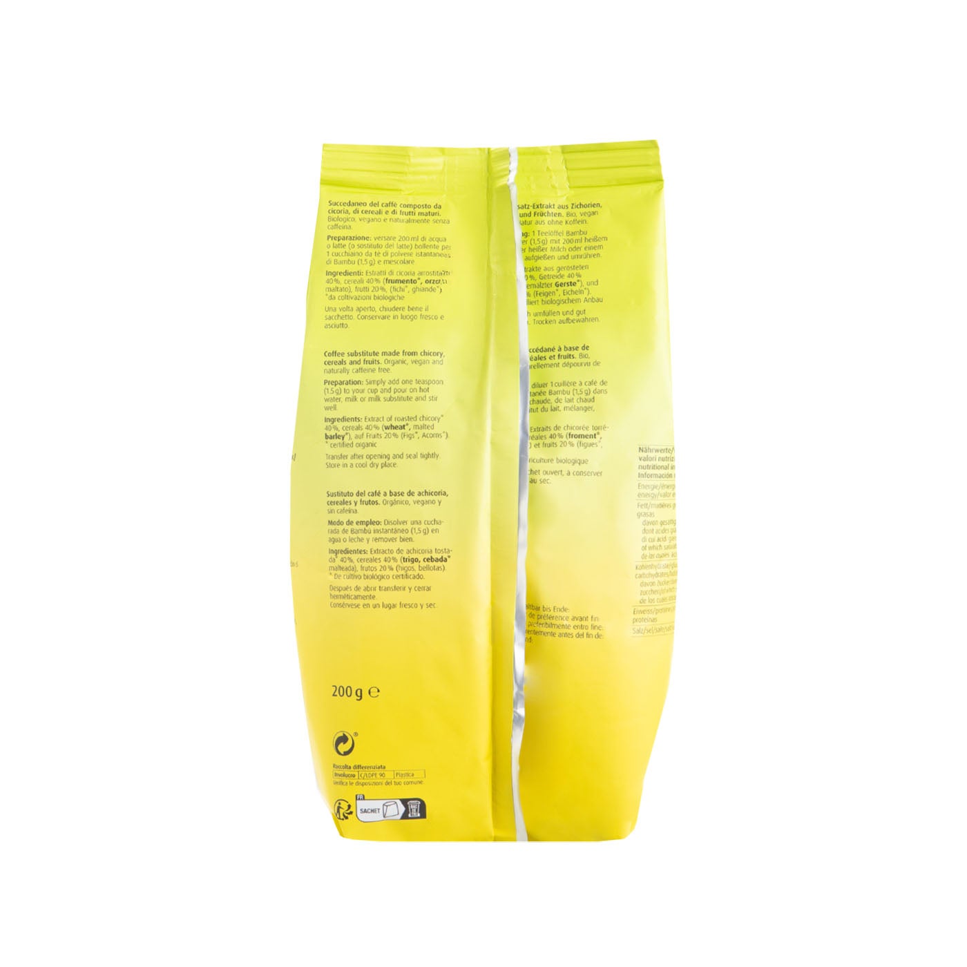 Polvo de cereales instantáneo elaborado a partir de extractos tostados de raíz de achicoria, cereales y frutas, todos procedentes de cultivo biológico. Su sabor natural y ligeramente tostado lo convierte en una alternativa ideal al café tradicional, sin cafeína y apta para disfrutar en cualquier momento del día.