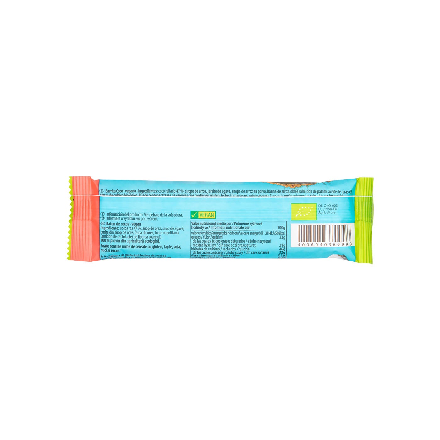 Coco rallado* (47,00%), jarabe de arroz*, jarabe de agave*, polvo de jarabe de arroz*, harina de arroz*, oblea* (almidón de patata*, aceite de girasol*).