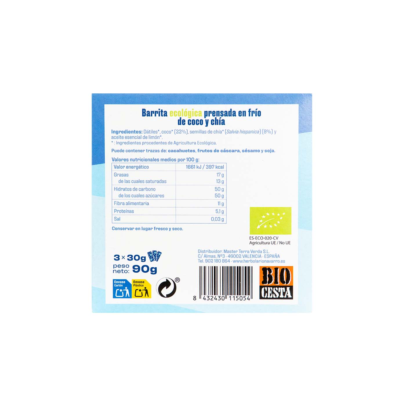 La Barrita de Coco y Chía de Bio Cesta es un snack ecológico y saludable elaborado a base de ingredientes naturales. Combina la dulzura de los dátiles con el sabor tropical del coco y el poder nutritivo de las semillas de chía. Además, contiene un toque refrescante de aceite esencial de limón, haciendo de esta barrita una opción deliciosa y energizante para disfrutar en cualquier momento del día.