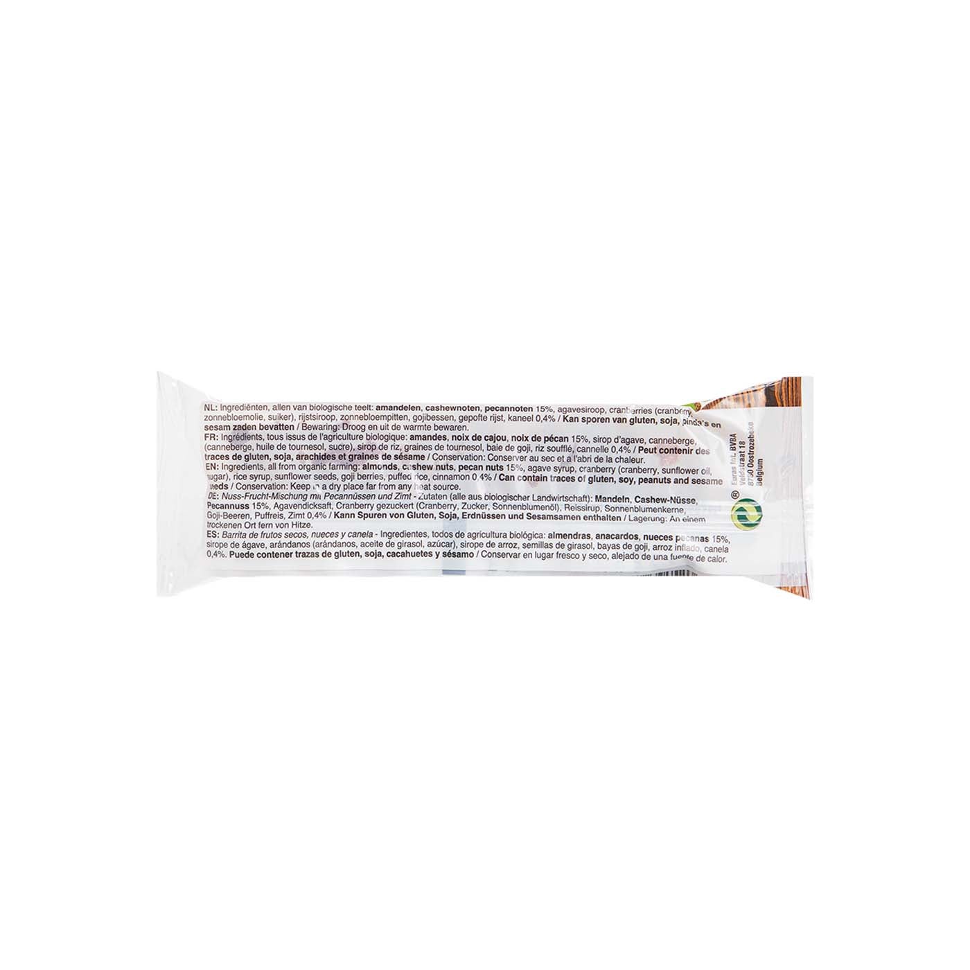 Nueces pecanas* 18% , sirope de ágave , nuecesdeBrasil 12% , almendras* 12% ,arándanos 10% (arándanos, aceite degirasol*, azúcar*), sirope de arroz , anacardos 6% , semillas degirasol , bayas de goji 4% , arroz inflado , canela .*De agricultura ecológica