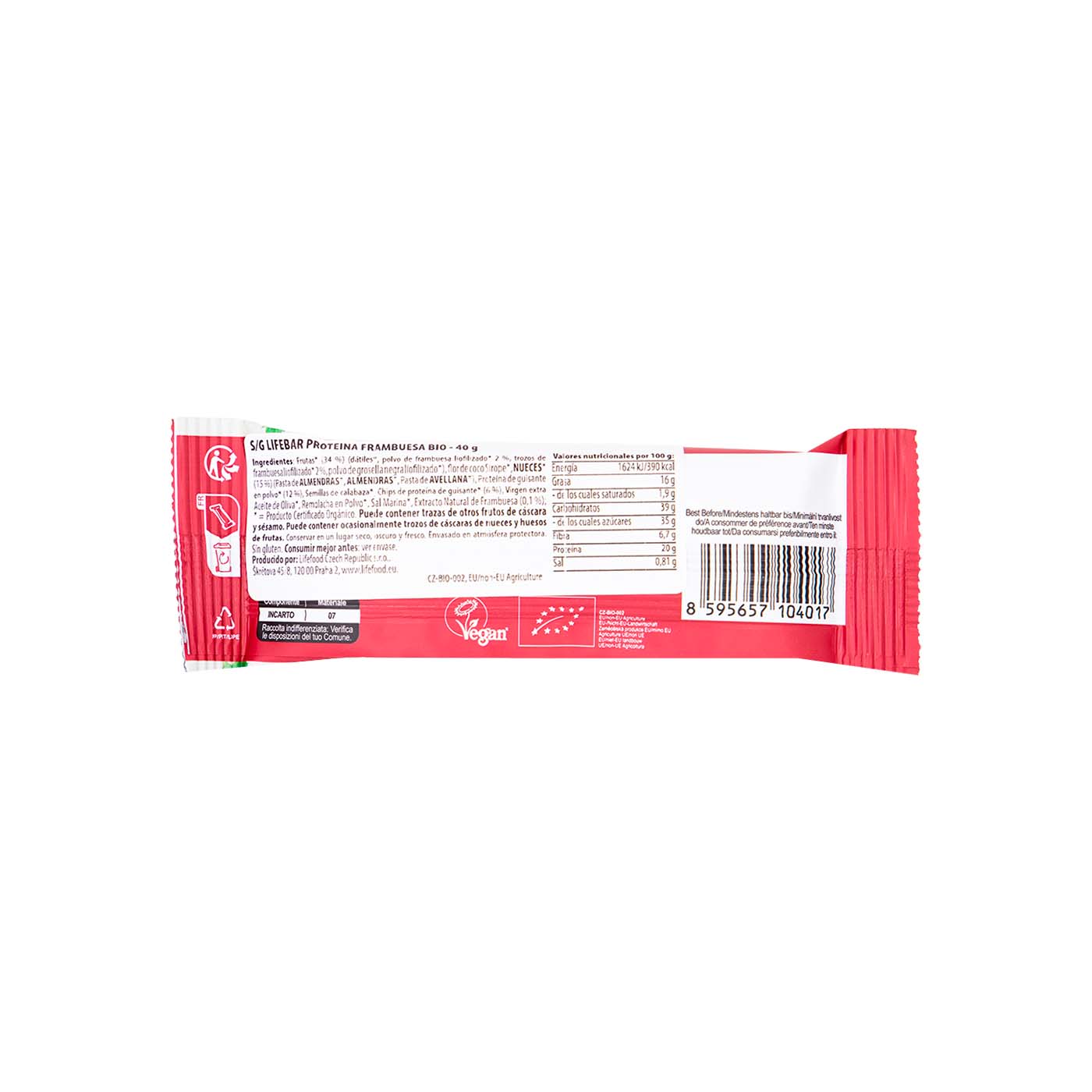 Barrita de Proteína Lifebar sabor Frambuesa sin Gluten 40g Lifefood