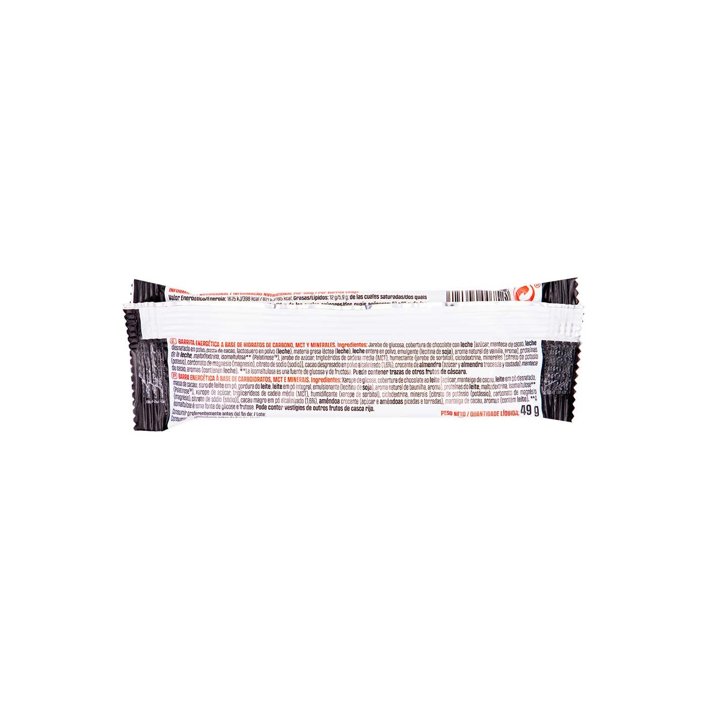 Jarabe de glucosa, cobertura de chocolate con leche [azúcar, manteca de cacao, leche desnatada en polvo, pasta de cacao, lactosuero en polvo (leche), materia grasa láctea (leche), leche entera en polvo, emulgente (lecitina de soja), aroma natural de vainilla, aroma], proteínas de la leche, maltodextrina, isomaltulosa*, jarabe de azúcar, triglicéridos de cadena media (MCT), humectante (jarabe de sorbitol), ciclodextrina (Cluster Dextrin®), minerales [citrato de potasio (potasio), carbonato de magnesio (magnesio), citrato de sodio (sodio)], cacao desgrasado en polvo alcalinizado (1,6%), crocante de almendra (azúcar y almendra troceada y tostada), manteca de cacao, aromas (contienen leche).