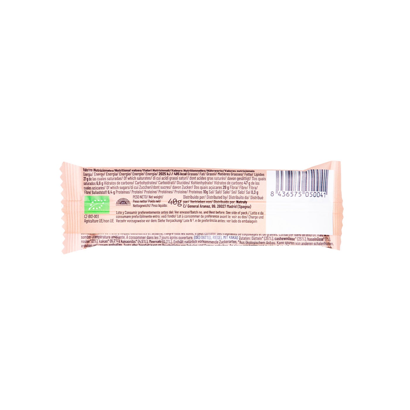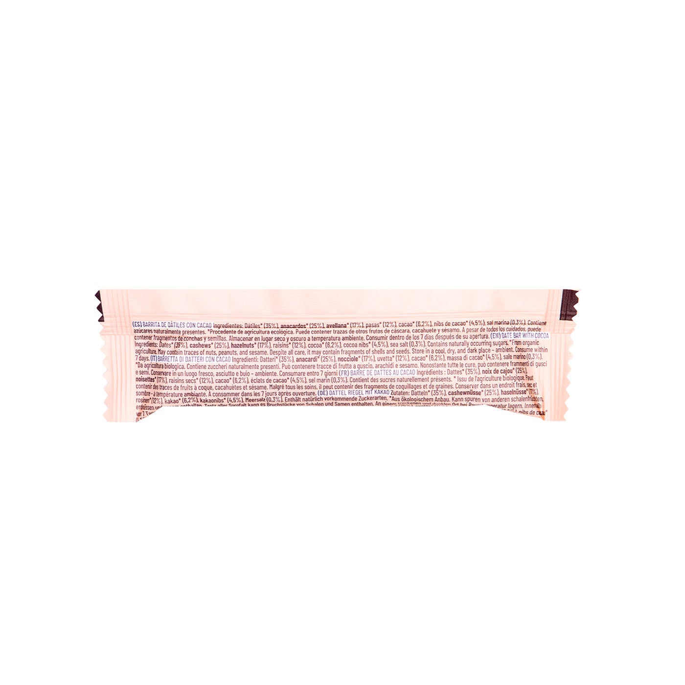 Dátiles* (35%), Anacardos* (25%), Avellana* (17%), Pasas* (12%), Cacao* (6,2%), Nibs de cacao* (4,5%), Sal marina (0,3%). *Procedente de agricultura ecológica.