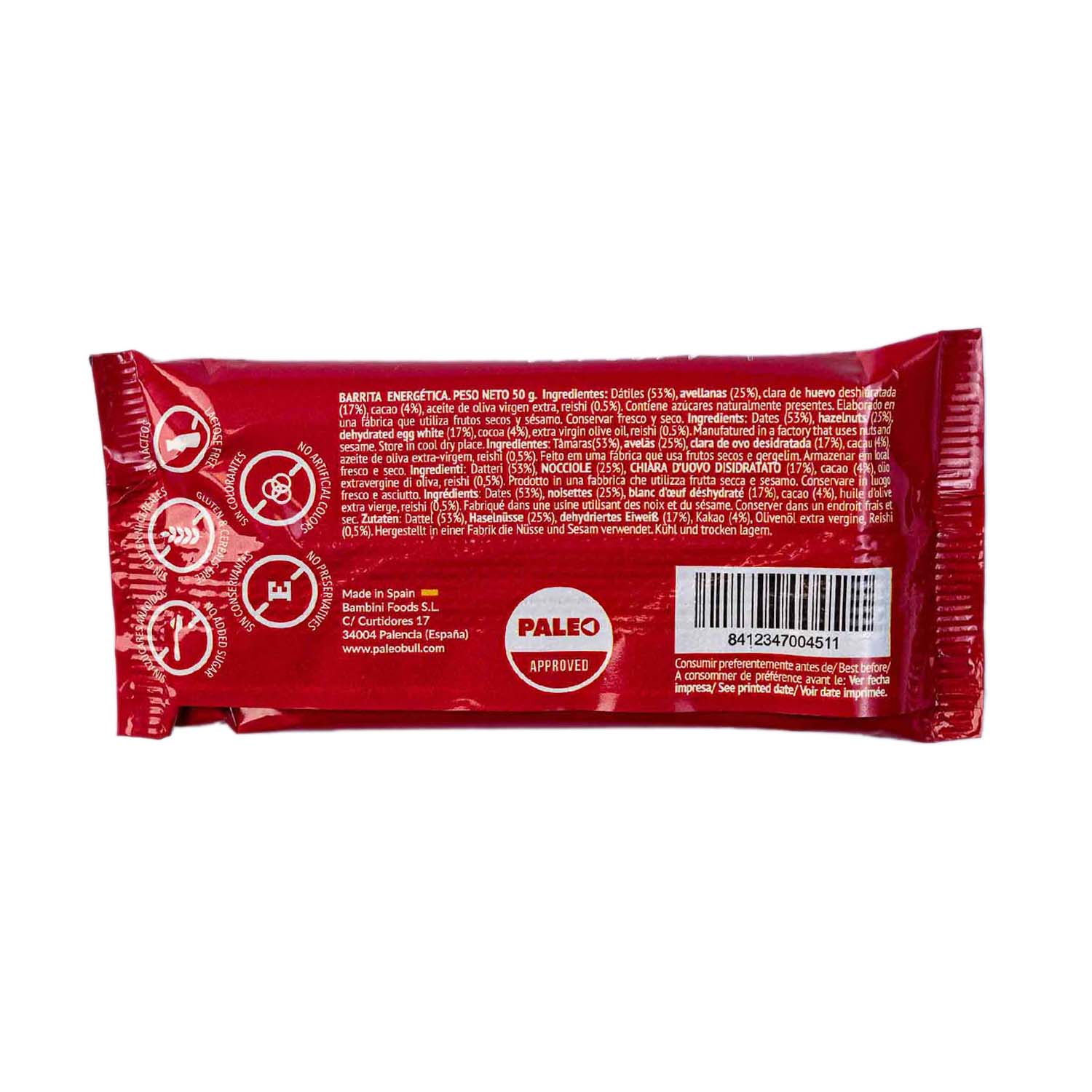 Barrita Paleobull sabor cacao. Disfruta de esta deliciosa barrita energética de cacao y reishi con alto contenido en proteínas. Compuesta exclusivamente por ingredientes naturales: dátiles, avellanas, clara de huevo deshidratada, cacao, aceite de oliva virgen extra y reishi. Ideales para un estilo de vida saludable.