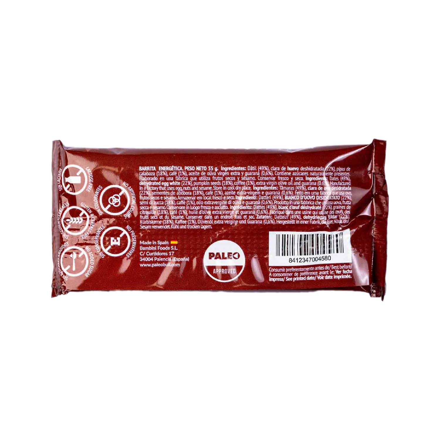 Barrita Paleobull sabor café. Disfruta de esta deliciosa barrita energética de café y guaraná con alto contenido en proteínas. Compuesta exclusivamente por ingredientes naturales: dátiles, clara de huevo deshidratada, pipas de calabaza, café y guaraná. Ideales para un estilo de vida saludable. Las barritas Paleobull son una fuente natural de energía. Sin aceites vegetales refinados, sin azúcares añadidos, sin cereales ni gluten, sin lactosa y sin conservantes ni colorantes artificiales.