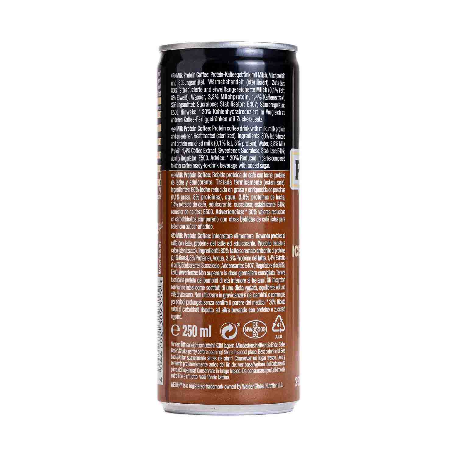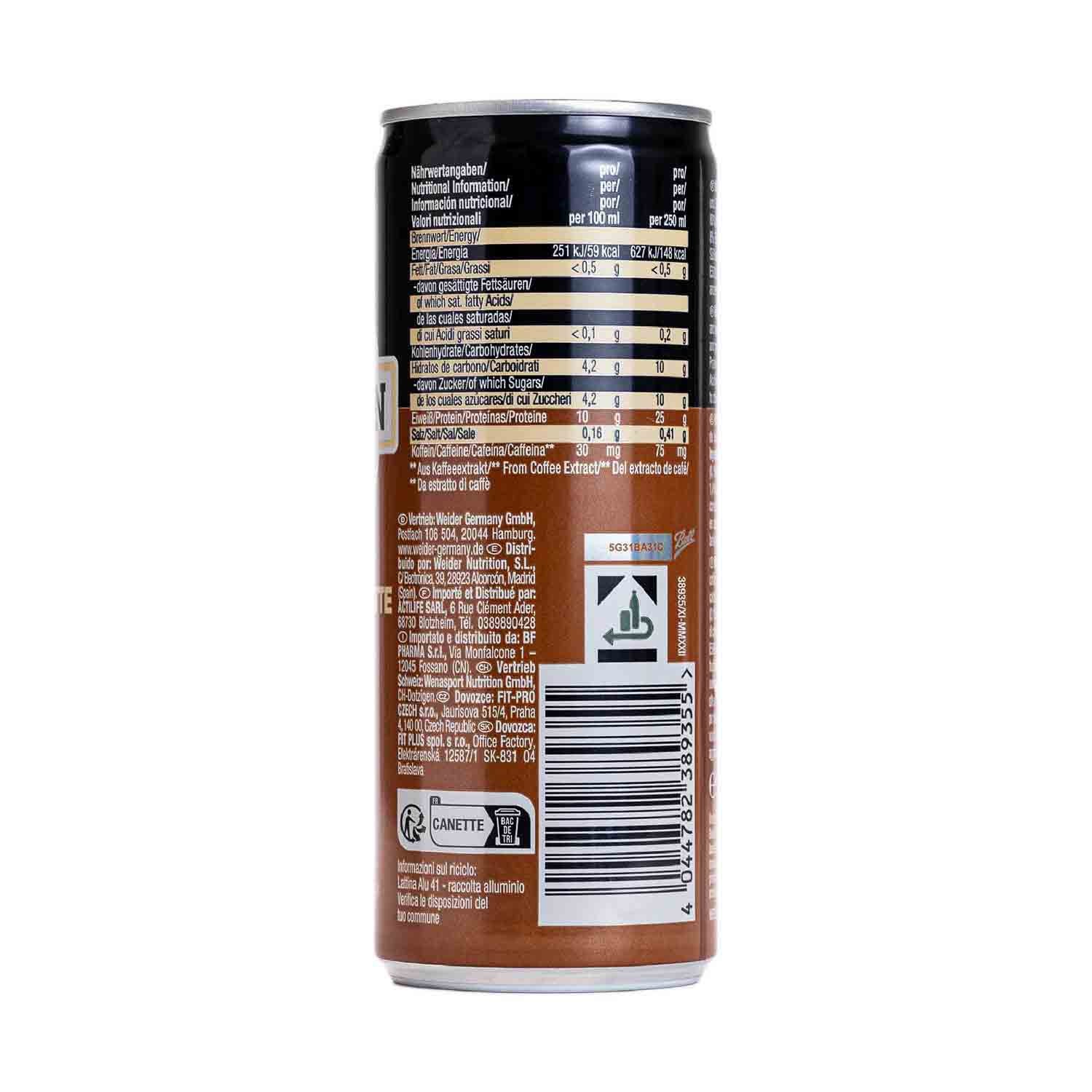 Batido de proteínas bajo en hidratos de carbono sabor café de Weider. Cómodo formato listo para tomar.