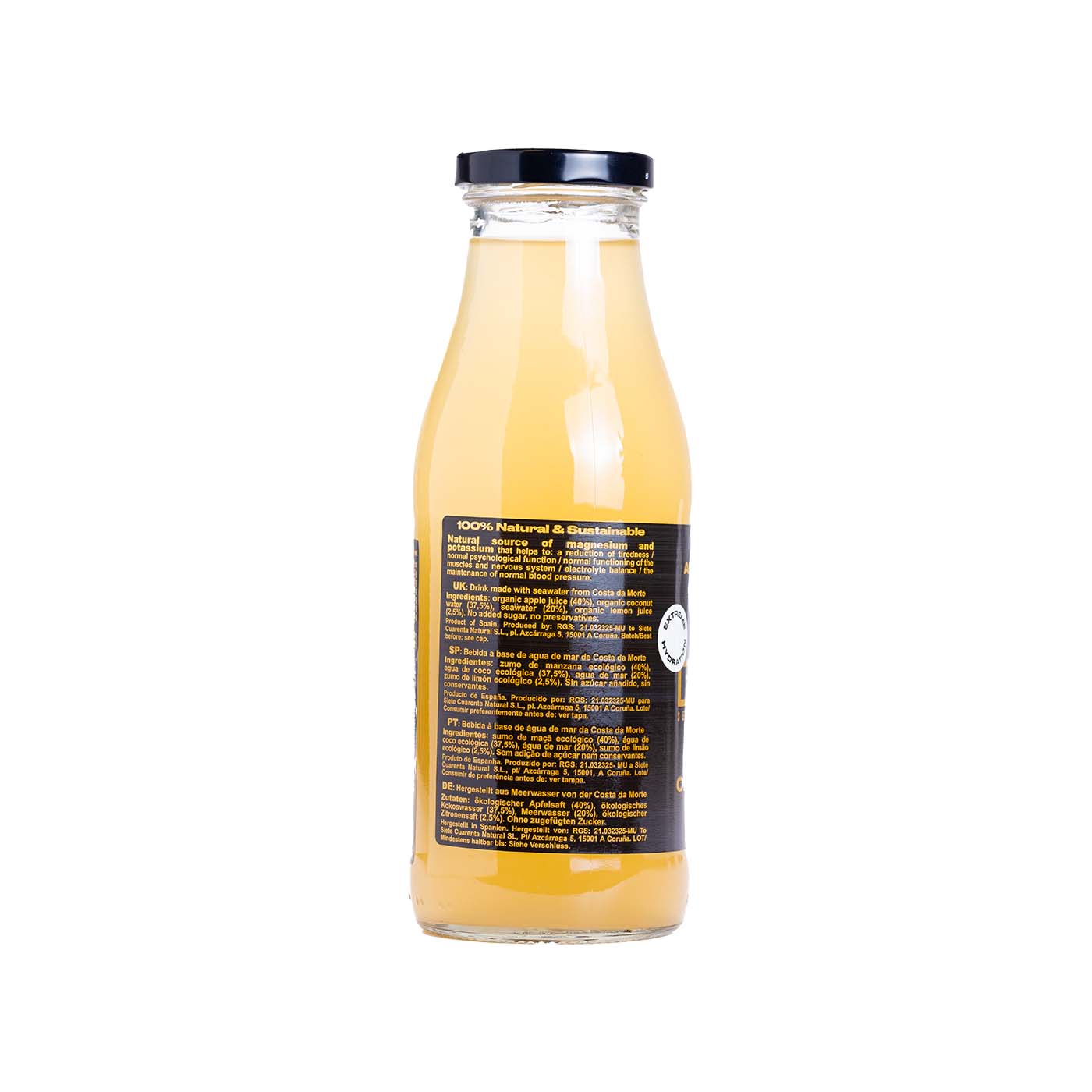 Zumo de manzana ecológico (40%), agua de coco ecológica (37,5%), agua de mar de Costa da Morte (20%), zumo de limón ecológico (2,5%).