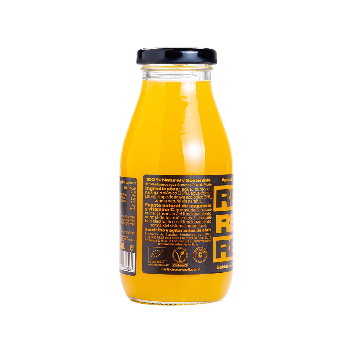 Agua, zumo de naranja ecológico (25%), agua de mar (20%), sirope de ágave ecológico (3%), aroma natural de naranja.