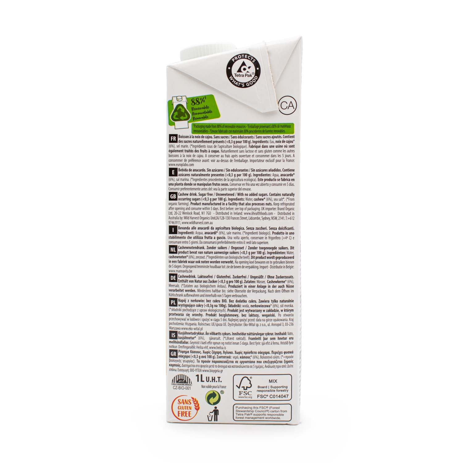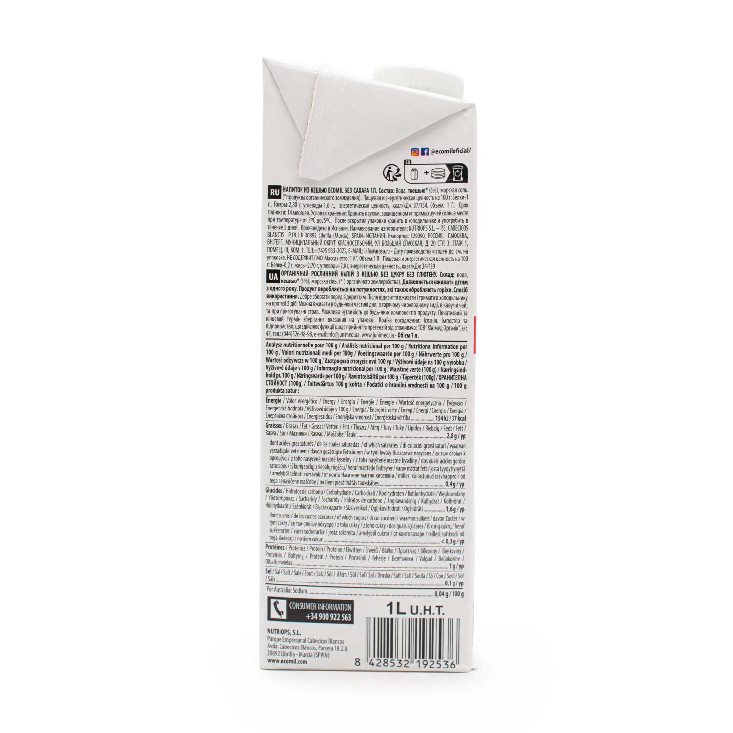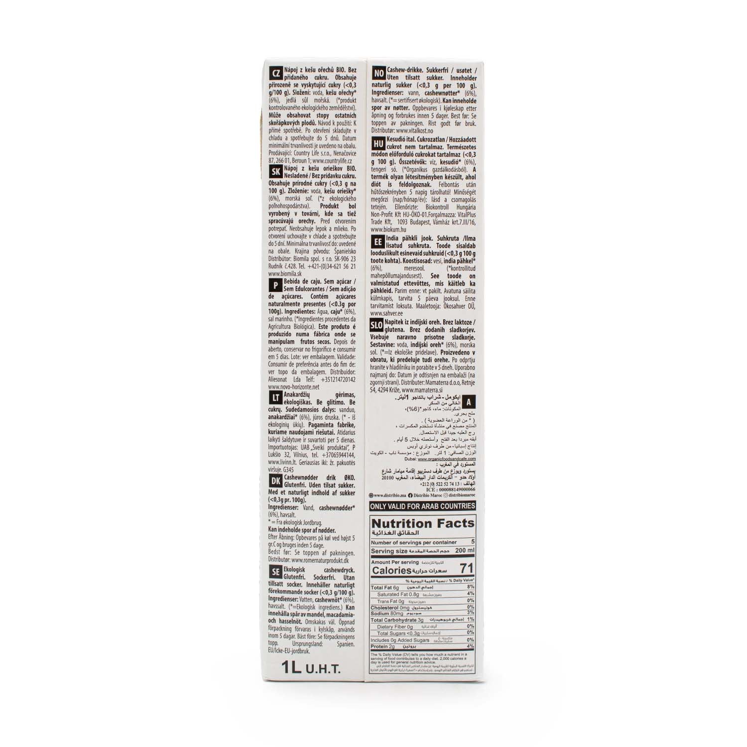 Bebida de Anacardo Bio de Ecomil. Sin azucar, sin gluten, sin Lactosa. Se puede consumir en cualquier momento del día, calientes o frías, en el café o en el té y se pueden utilizar en la preparación de recetas: salsas, pasteles, bizcocho,...