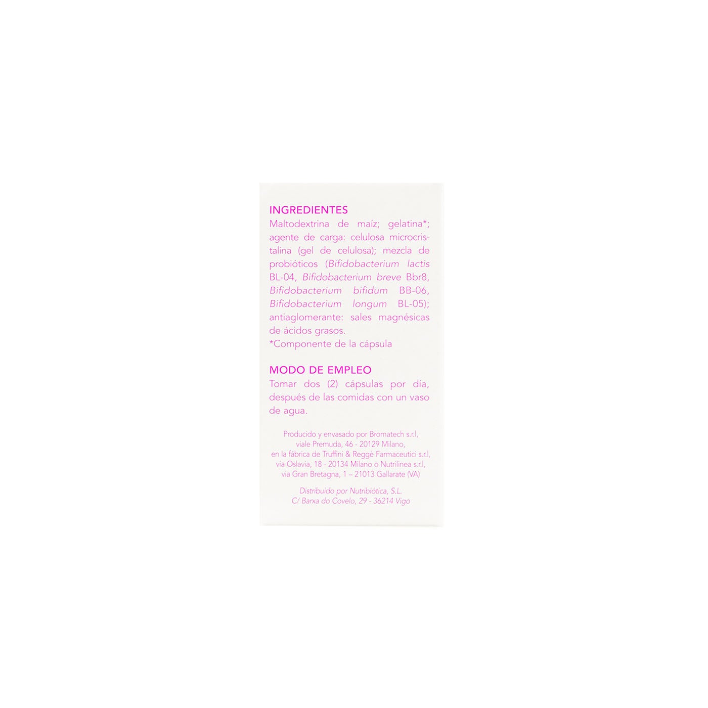 Maltodextrina de maíz; gelatina (cápsula); agentes de carga: celulosa microcristalina; mezcla de fermentos lácteos (Bifidobacterium lactis BL04, Bifidobacterium breve BB03, Bifidobacterium bifidum BB06, Bifidobacterium longum BL05); antiaglomerantes: sales de magnesio de los ácidos grasos, Dióxido de silicio.