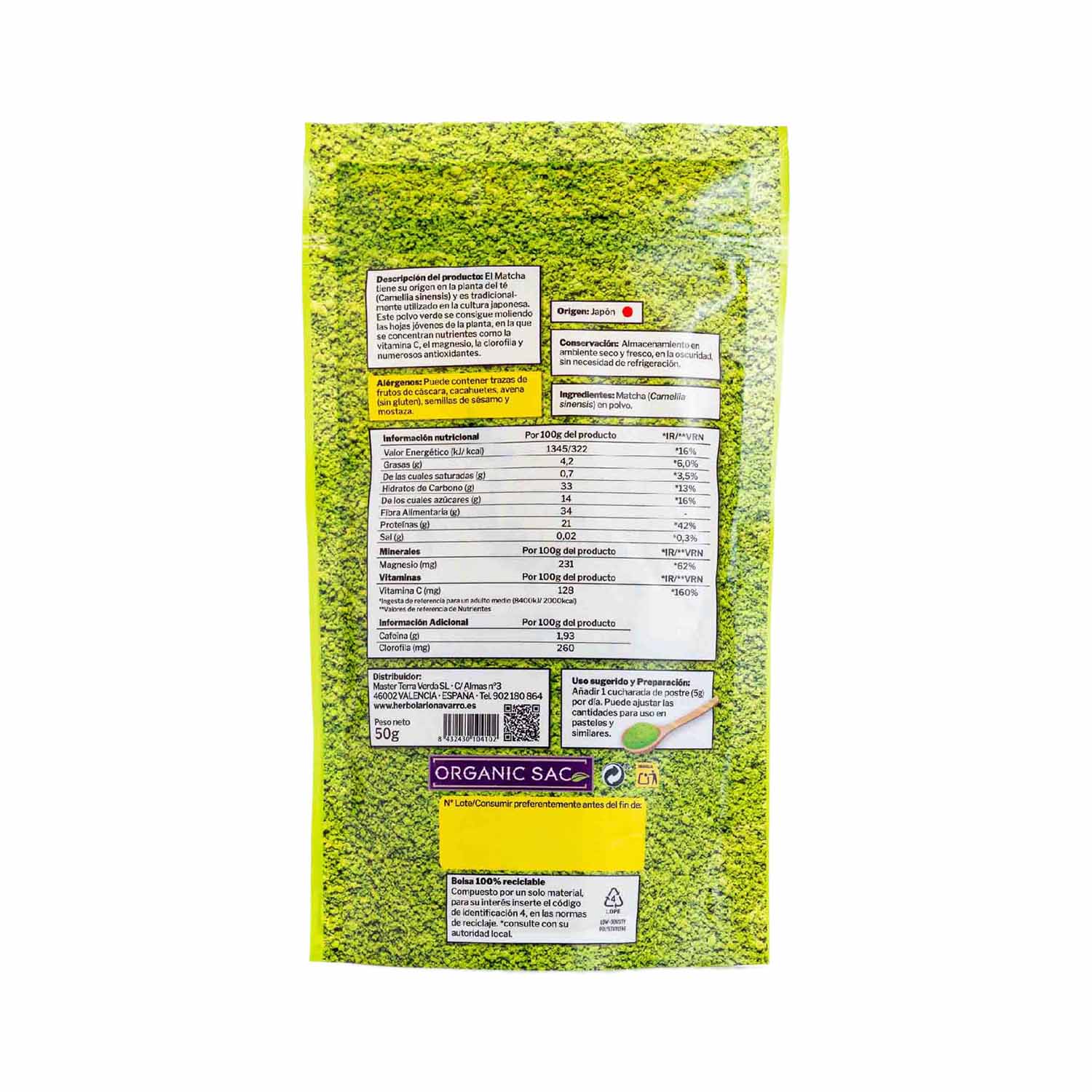 Opiniones de Bio Té Matcha en polvo 50g Organic Sac