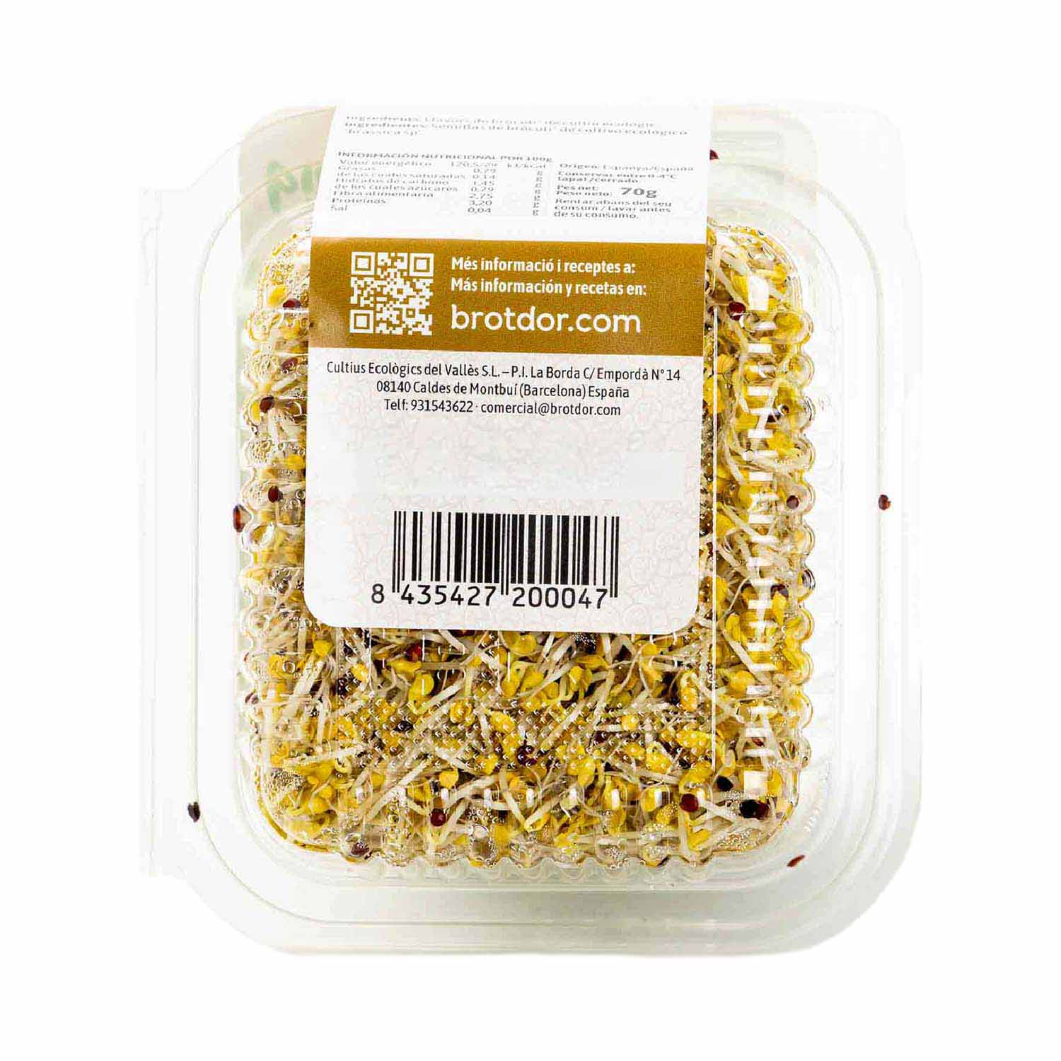 Son una variedad de alimentos vivos que consisten en semillas de brócoli germinadas, es decir, que han sido hidratadas y han comenzado su proceso de crecimiento. Estos brotes son conocidos por su alto contenido nutricional, especialmente en compuestos bioactivos como el sulforafano. Los brotes de brócoli de Brot d'Or se destacan por ser productos frescos y ecológicos, cultivados sin el uso de pesticidas ni químicos.