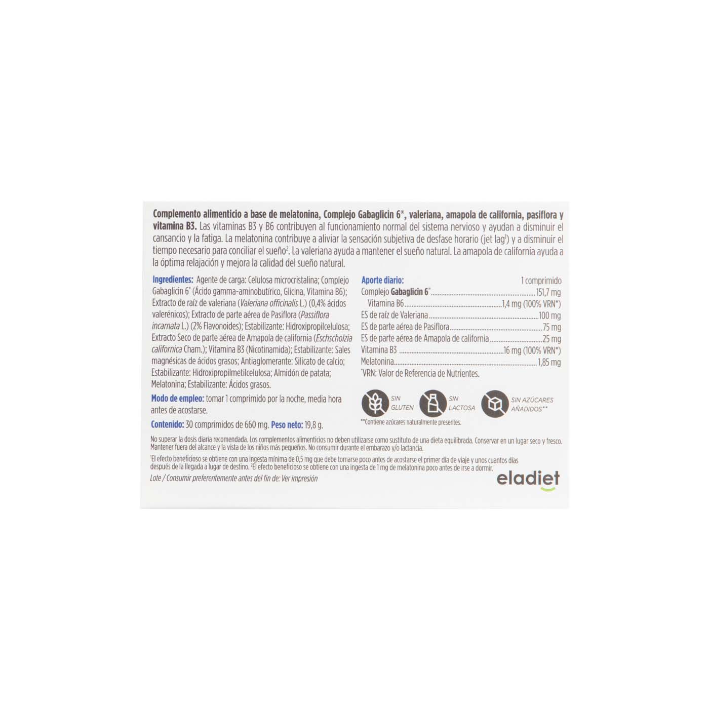 Ingredientes activos (Por 1 comprimido): Complejo Gabaglicin 6® (151,7 mg), Vitamina B6 1,4 mg (100% VRN*); ES de raíz de Valeriana (100 mg); ES de parte aérea de Pasiflora (75 mg); ES de parte aérea de Amapola de california (25 mg); Vitamina B3 (16 mg (100% VRN*), Melatonina (1,85 mg).