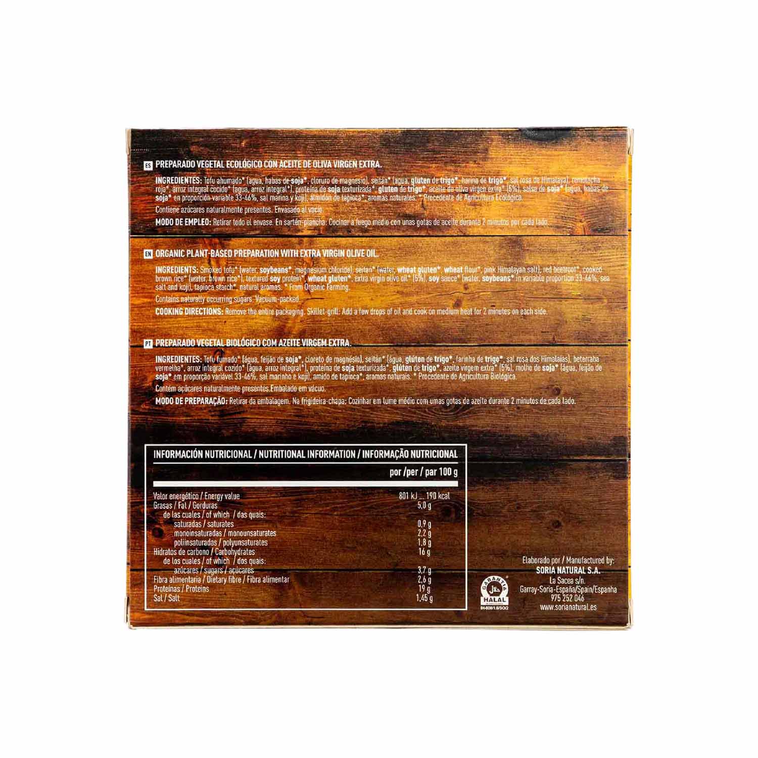 Tofu* ahumado (agua, habas de soja*, cloruro de magnesio), seitán* (agua, gluten de trigo*, harina de trigo*, sal rosa de Himalaya), remolacha roja*, arroz integral cocido* (agua, arroz integral*), proteína de soja texturizada*, gluten de trigo*, aceite de oliva virgen extra* (5%), salsa de soja* (agua, habas de soja* en proporción variable 33-46%, sal marina y koji), almidón de tapioca*, aromas naturales.