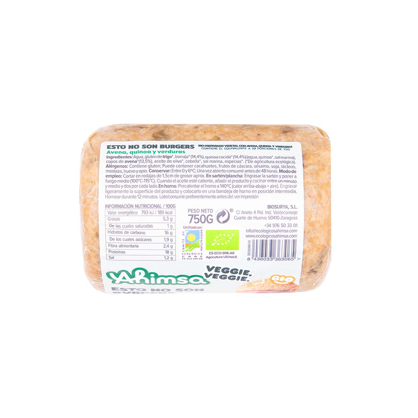 Agua, gluten de trigo* (seitán) (19%), borraja* (14,4%), quinoa cocida* (14,4%) (agua, quinoa*, sal marina), copos de avena*, aceite de oliva*, cebolla*, sal marina, especias*.