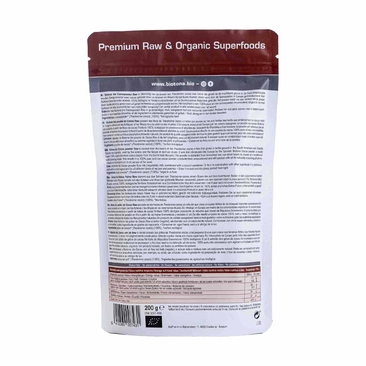Cacao Raw Powder de Biotona es polvo de cacao 100% puro y fresco, no modificado y no azucarado, por lo que mantiene todos los fitonutrientes naturales.