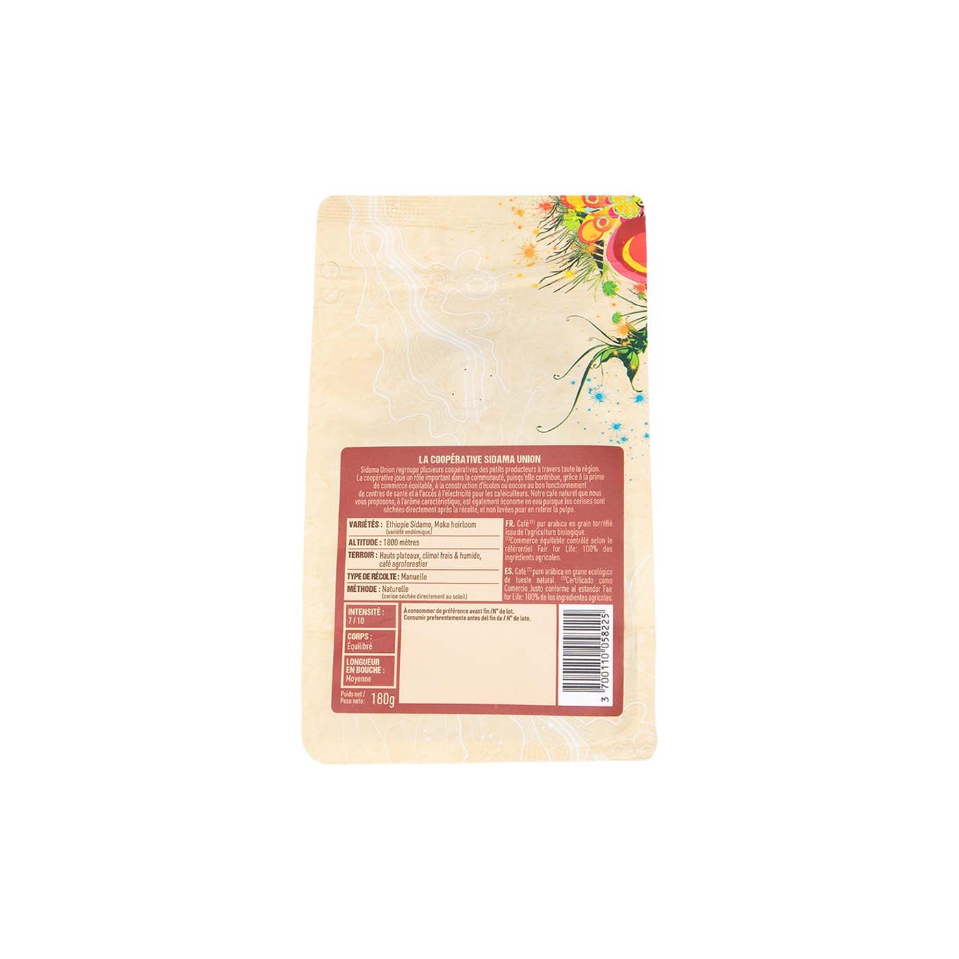 Café puro arábica en grano ecológico de tueste natural. Certificado como Comercio Justo coforme al estándar Fair for Life: 100% de los ingredientes agrícolas.
