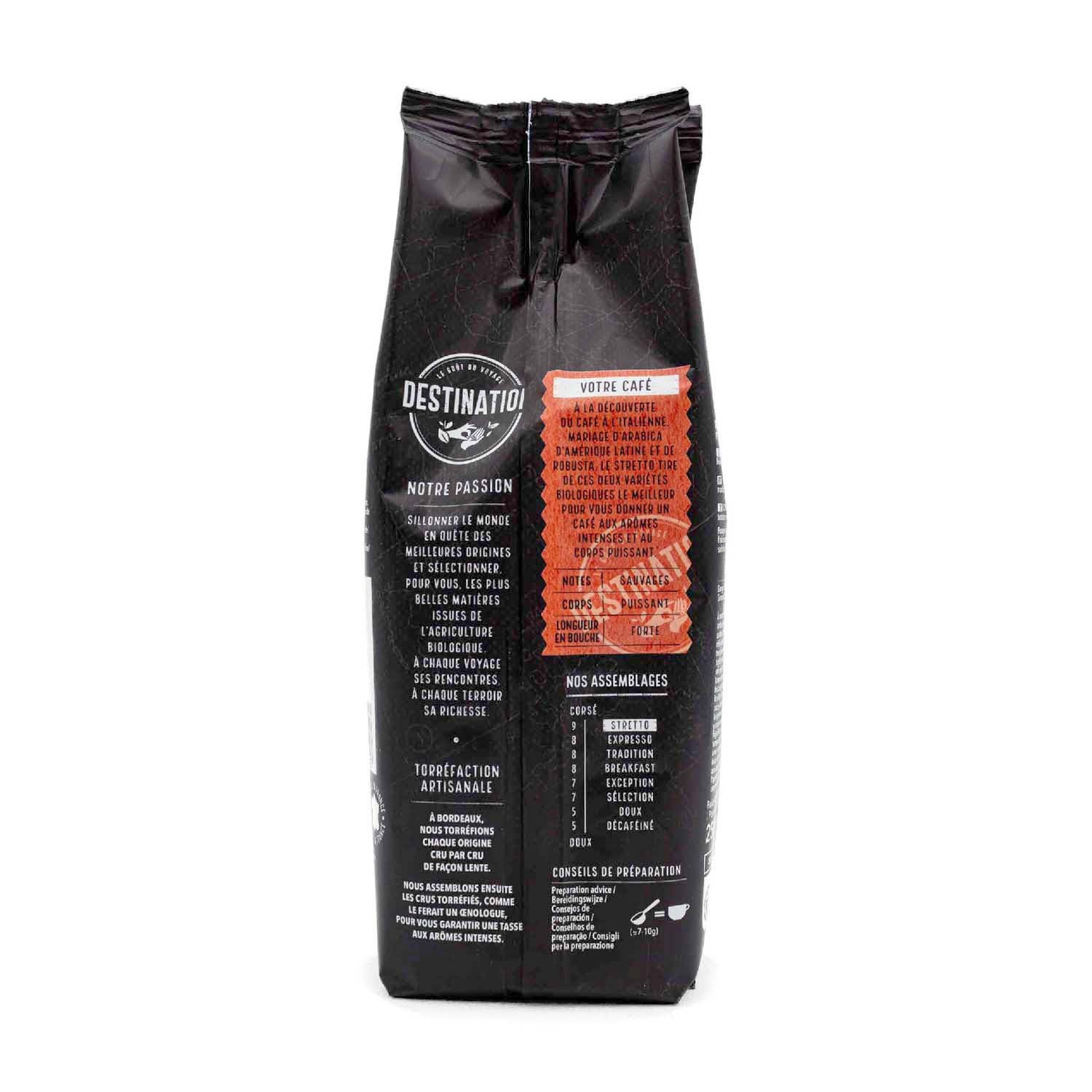 ¡Disfruta de la mezcla perfecta de Arábica de Latinoamérica y Robusta en cada taza! La intensidad única de aroma y sabor del Café Stretto italiano molido de Destination 100% ecológico, justo y sostenible.