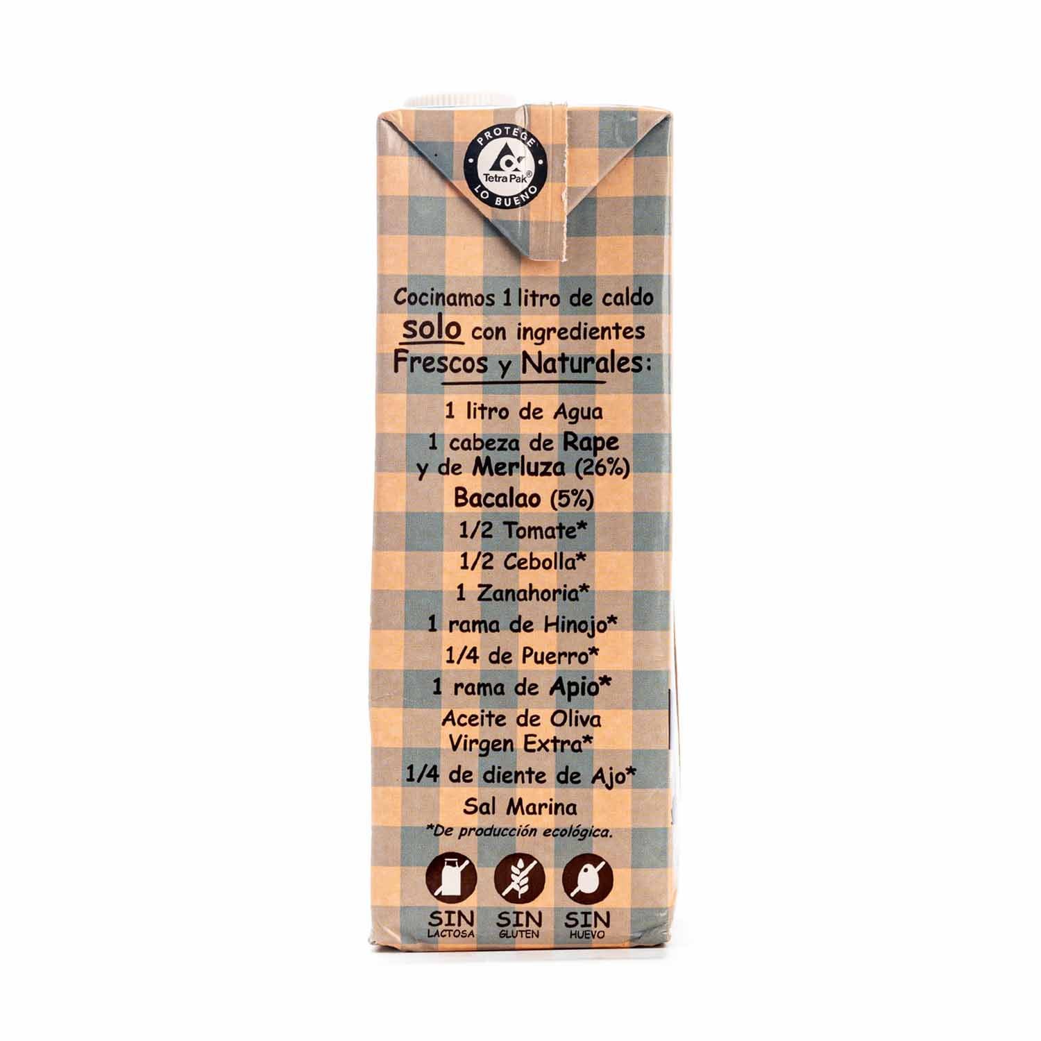 1 litro de Agua, 1 cabeza de Rape y de Merluza (26%), Bacalao (5%), 1/2 Tomate*, 1/2 Cebolla*, 1 Zanahoria*, 1 rama de Hinojo*, 1/4 de Puerro*, 1 rama de Apio*, Aceite de Oliva Virgen Extra*, 1/4 de diente de Ajo*, Sal Marina. (*)De producción ecológica.