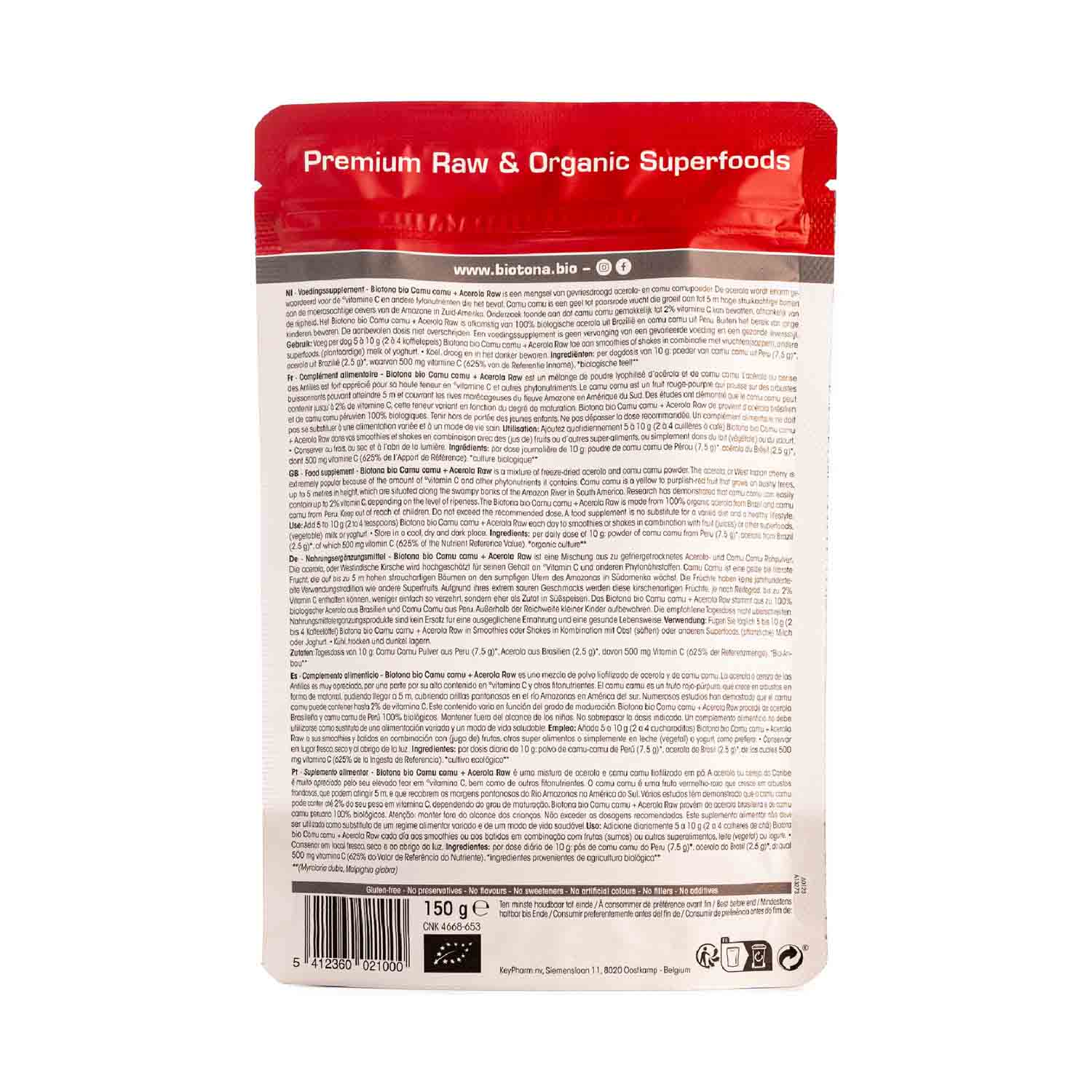 Este complemento alimenticio es una combinación única de acerola y camu camu, dos superfrutas cargadas de beneficios. La acerola, también conocida como cereza de las Antillas, es apreciada por su alto contenido en vitamina C y otros fitonutrientes. Por otro lado, el camu camu es un fruto rojo-púrpura que crece en arbustos en las orillas pantanosas del río Amazonas en América del Sur, rico tmbiñén en vitamina C. Biotona bio Camu camu + Acerola Raw proviene de acerola brasileña y camu camu peruano, ambos 100% orgánicos. Después de ser cosechadas y seleccionadas minuciosamente, las bayas se convierten en polvo mediante un proceso de liofilización, que preserva su sabor, olor y color, así como los nutrientes y fitonutrientes presentes de manera natural.