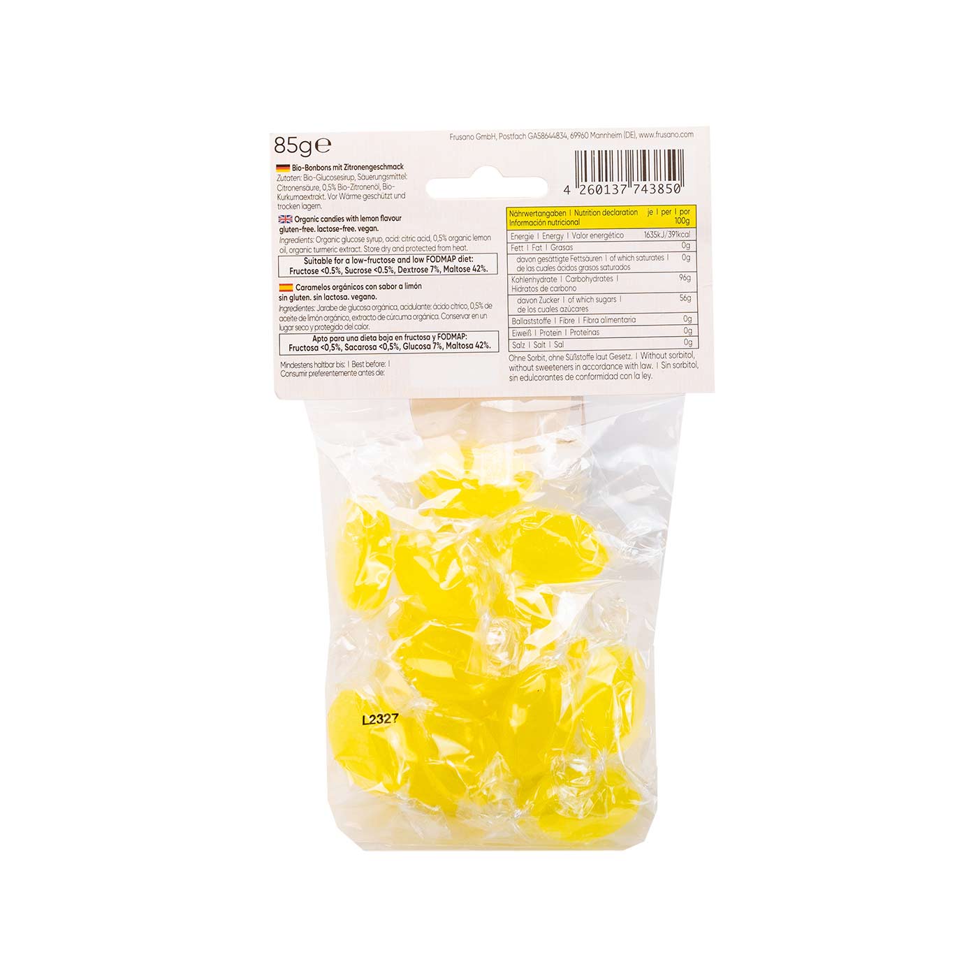 Los caramelos sabor Limón de Dextrosa sin Fructosa de Frusano están especialmente formulados para ser consumidos por personas con sensibilidad o intolerancia a la fructosa y siguen una dieta baja en fructosa y FODMAP: Fructosa <0,5%, Sacarosa <0,5%, Glucosa 7%, Maltosa 42%.