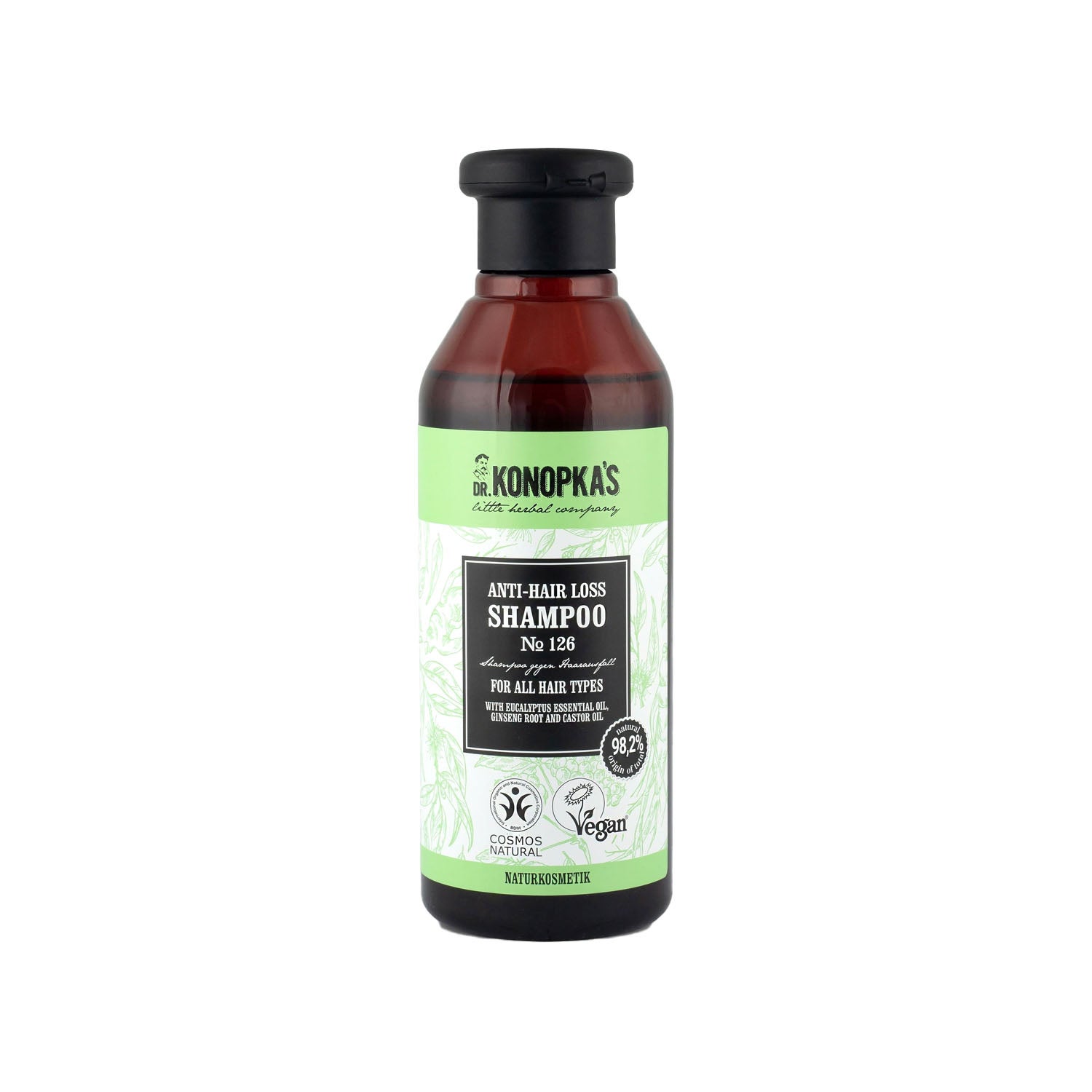 Dr. Konopka's nos descubre una nueva línea de productos para el cuidado del cabello, con ingredientes naturales y orgánicos, basados en las recetas herbales de Dr. Konopka. El Champú Anticaída 280ml contiene, entre sus principales ingredientes, raíz de ginseng orgánico, aceite de ricino y aceite esencial de eucalipto, para ayudar al mantenimiento natural de nuestro cabello desde la raíz hasta las puntas, aportando una nutrición intensa y un cuero cabelludo más revitalizado.