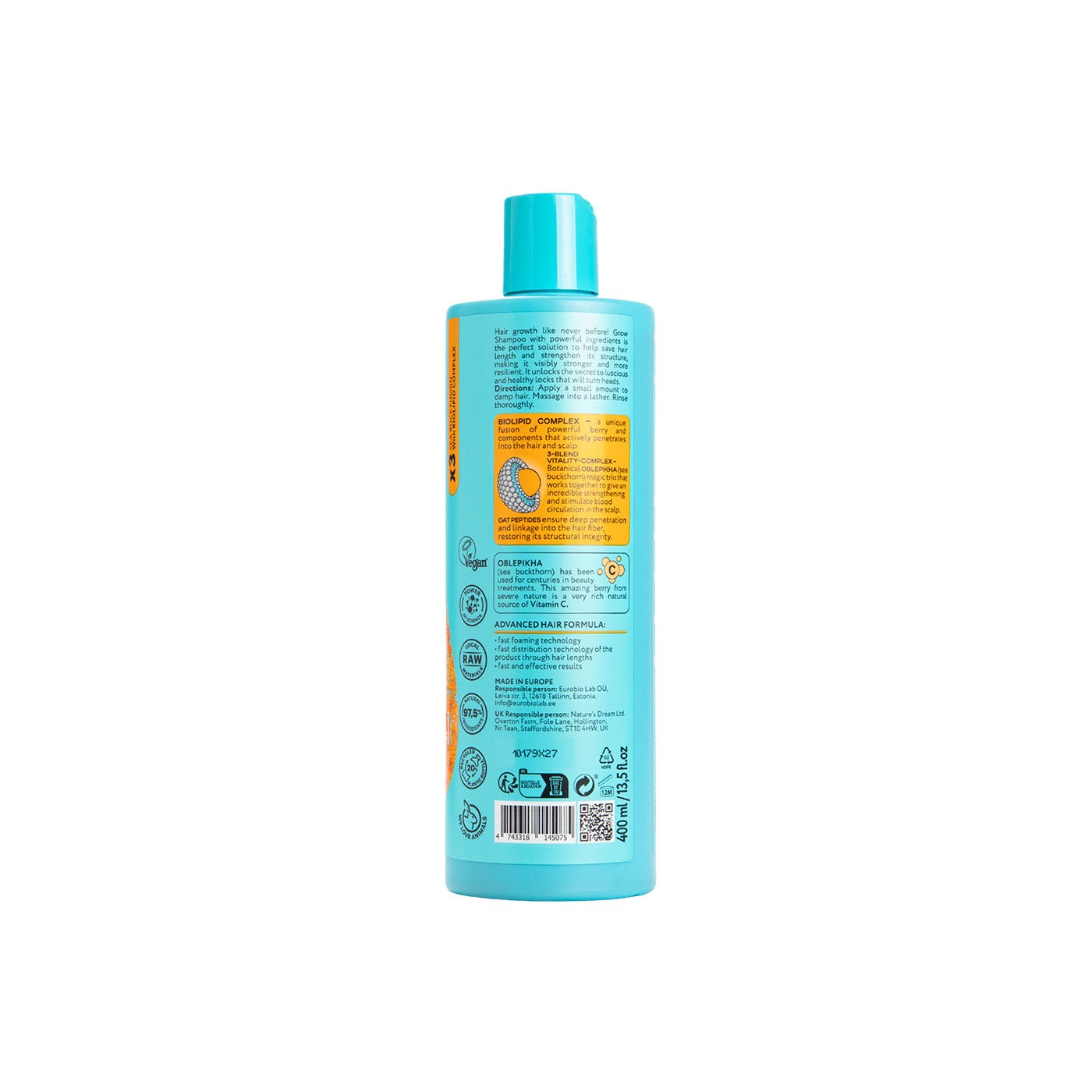 Aqua, Sodium Coco-Sulfate, Lauryl Glucoside, Cocamidopropyl Betaine, Sodium Chloride, Hippophae Rhamnoides Fruit Oil*, Hippophae Rhamnoides Fruit Extract*, Hippophae Rhamnoides Fruit WaterWH H, Hydrolyzed Lupine Protein*, Avena Sativa Peptide*, 1,2-Hexanediol, Caprylyl Glycol, Phospholipids, Glycine Soja Oil, Glycolipids, Glycine Soja Sterols, Argania Spinosa Kernel Oil*, Trifolium Pratense Flower Extract*, Mentha Piperita Leaf Extract*, Sorbus Aucuparia Fruit ExtractWH, Rubus Idaeus Fruit Extract*, Crataegus Monogyna Fruit/Leaf ExtractWH, Arctium Lappa Root ExtractWH, Glycerin, Menthol, Guar Hydroxypropyltrimonium Chloride, Citric Acid, Benzyl Alcohol, Dehydroacetic Acid, Sodium Benzoate, Potassium Sorbate, CI 15985, CI 19140, Parfum.