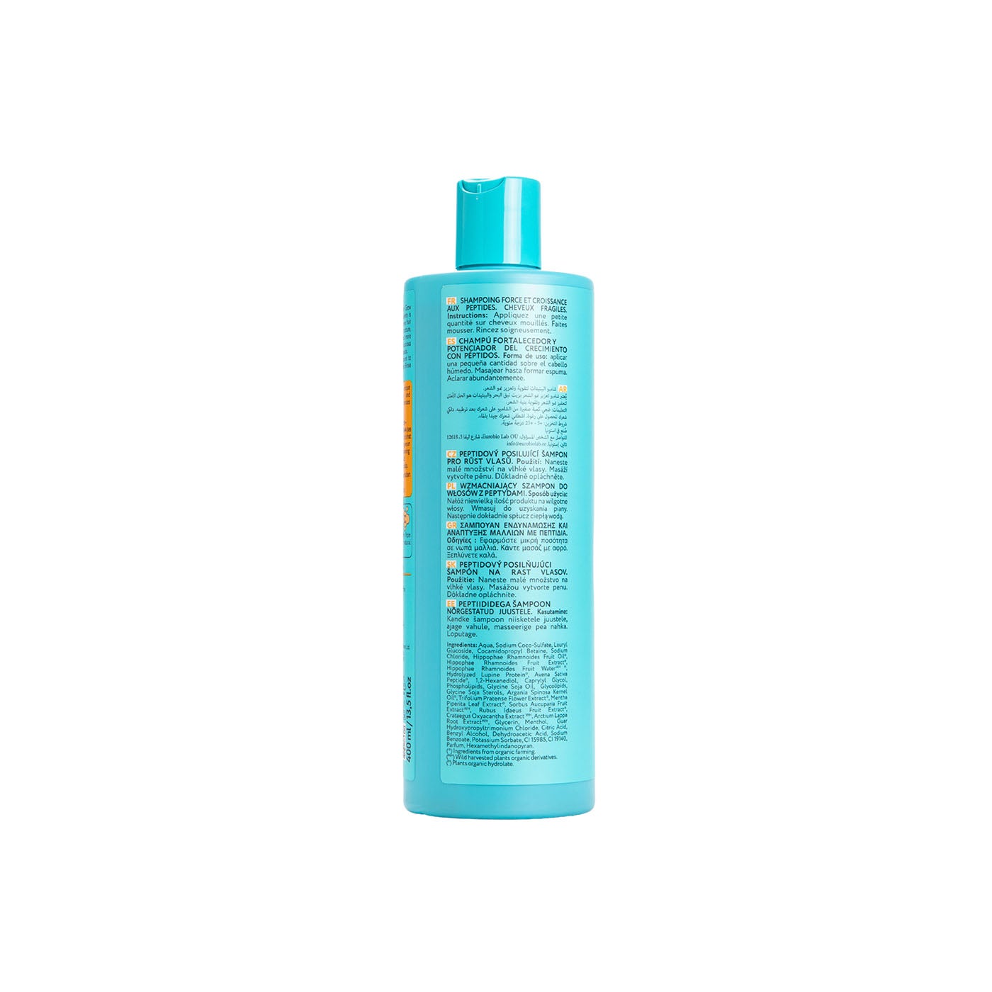 Este champú combina péptidos de avena y proteínas hidrolizadas de altramuz con extractos naturales para revitalizar el cuero cabelludo y fortalecer la fibra capilar. El espino amarillo, junto con aceites de argán y soja, nutre profundamente y aporta elasticidad. Extractos botánicos como trébol rojo, frambuesa, menta y bardana activan la microcirculación, favoreciendo un entorno óptimo para el crecimiento. Los lípidos vegetales, por su parte, ayudan a conservar la hidratación y protegen la estructura capilar.