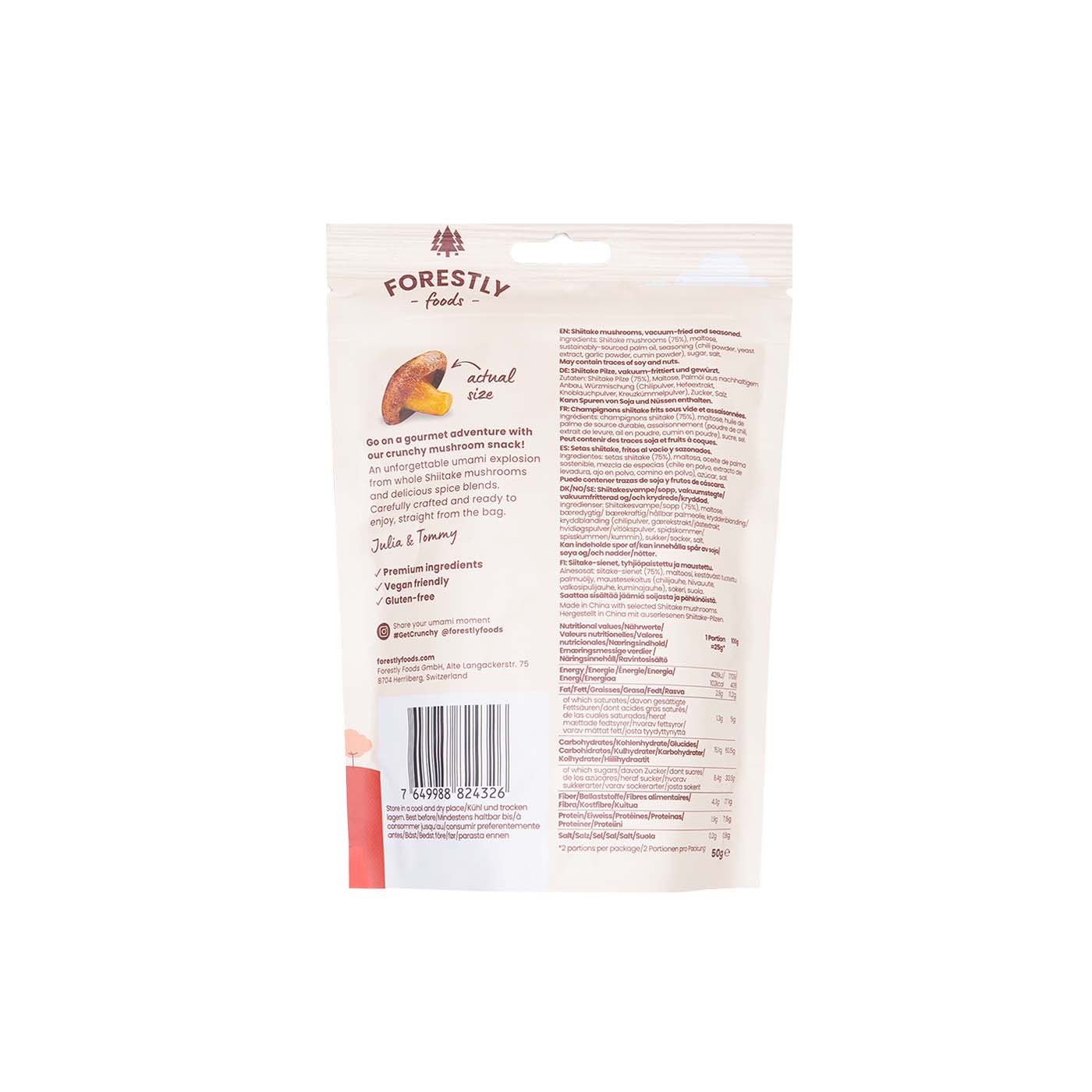 Setas shiitake 75%, maltosa, sal, polvo de chile, extracto de levadura, polvo de ajo, comino, azúcar, aceite de palma sostenible.