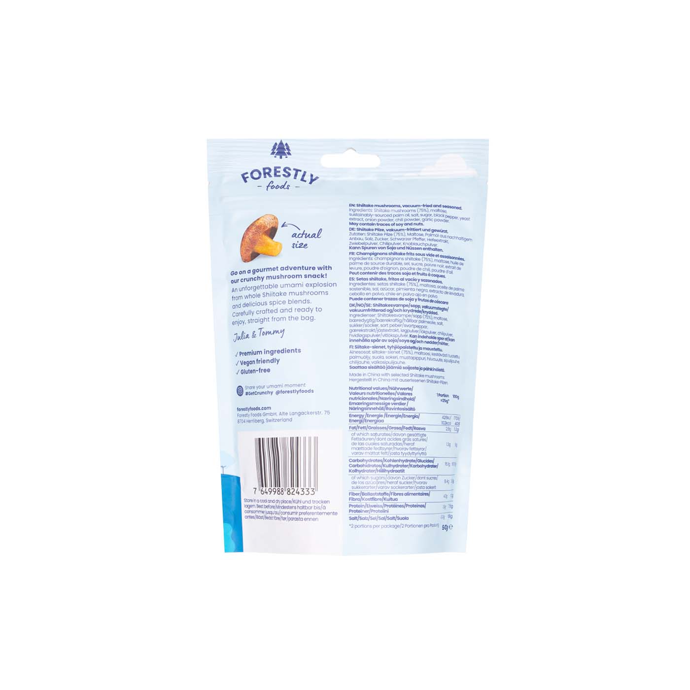 Los Chips de Setas de Forestly elaborados con shiitake orgánico, son ricos en fibra y contienen vitaminas y minerales clave, como el magnesio y el hierro. Además, su proceso de producción es sostenible, utilizando menos agua y espacio, lo que hace de estos chips una opción saludable y respetuosa con el planeta.