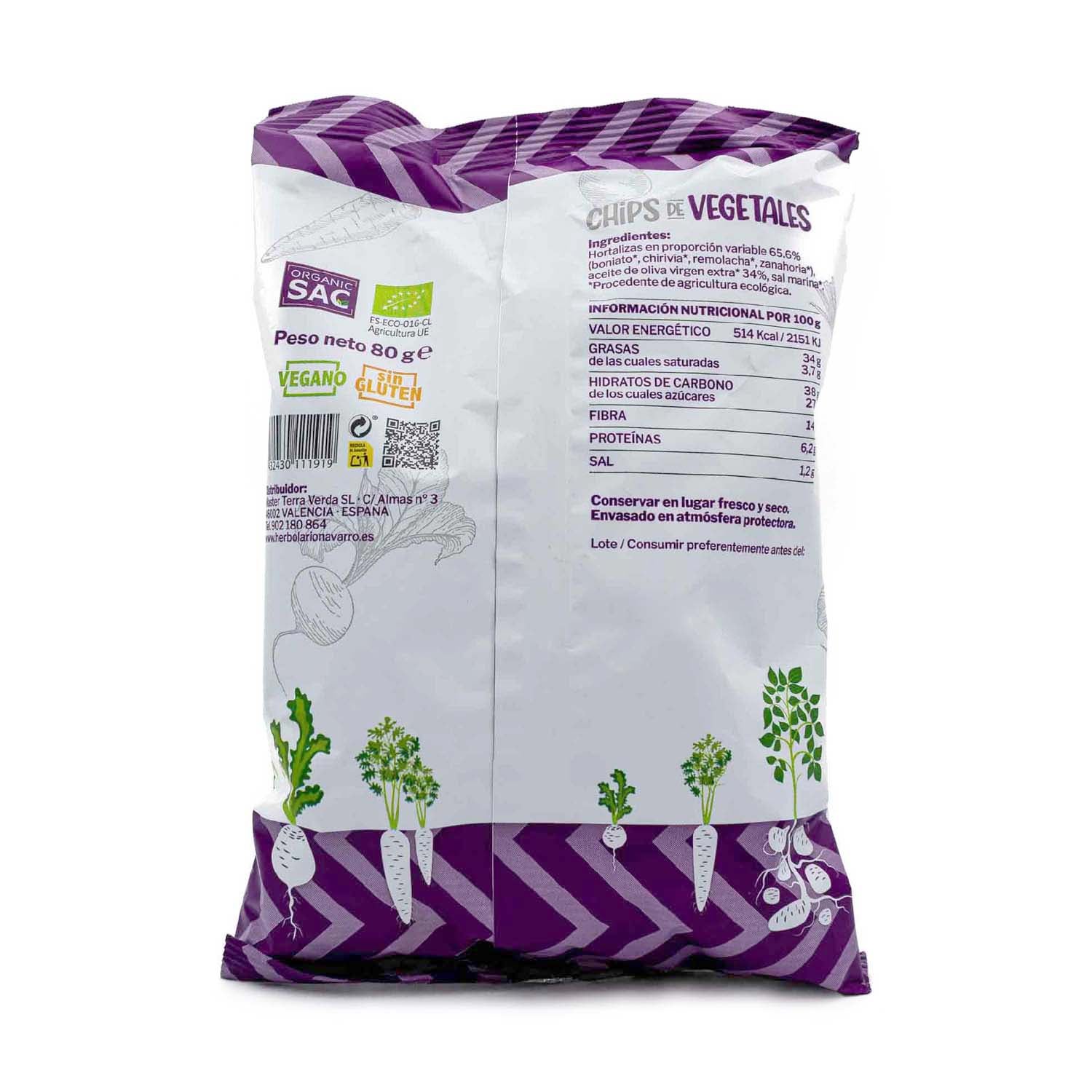 Delicioso tentempié elaborado principalmente con una variedad de hortalizas con certificado ecológico, que incluyen boniato, chirivía, remolacha y zanahoria. Estas hortalizas se combinan con aceite de oliva virgen extra y sal marina para crear una experiencia crujiente y sabrosa.