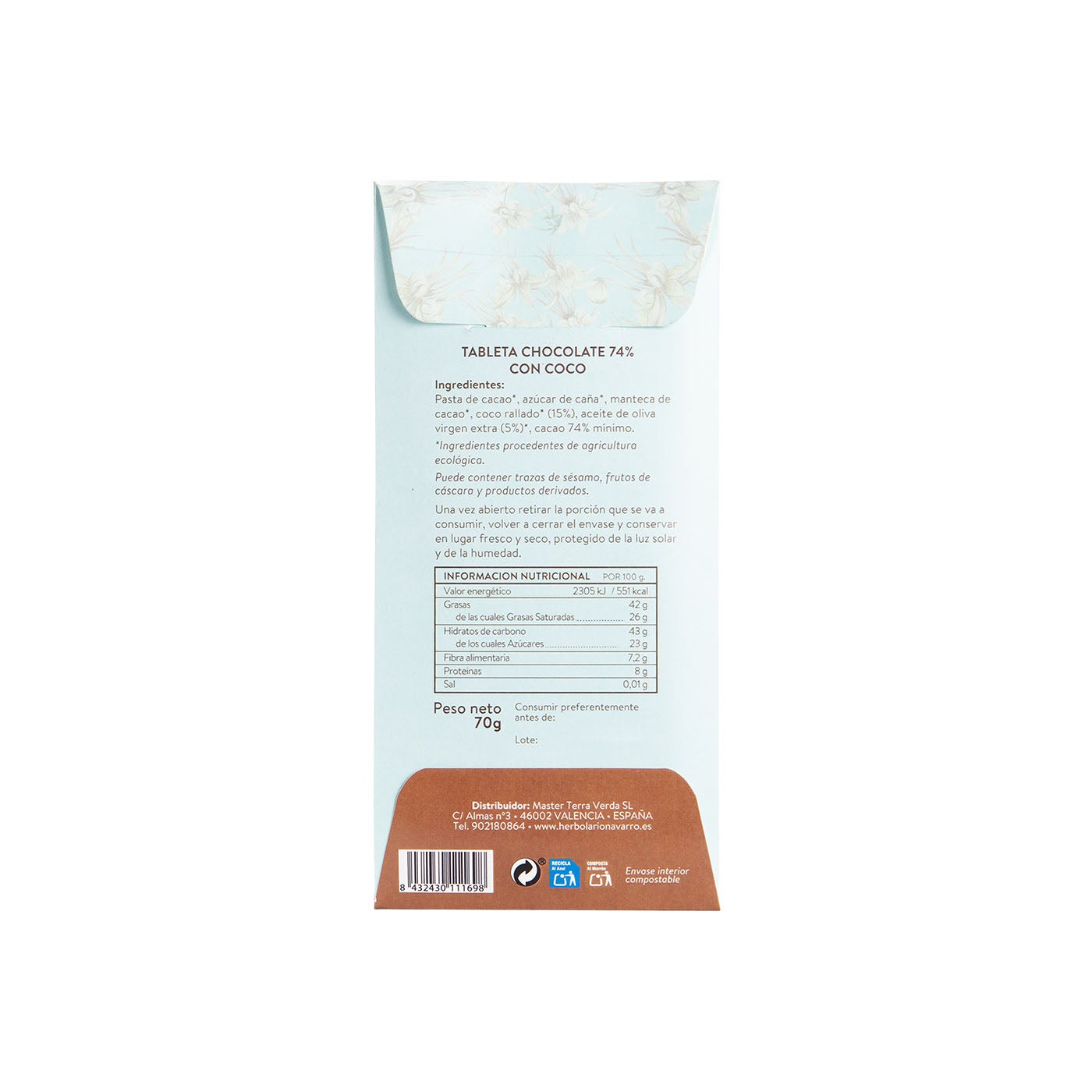Pasta de cacao*, azúcar de caña*, manteca de cacao*, coco rallado* (15%) y aceite de oliva virgen extra* (5%) cacao mínimo 74%.