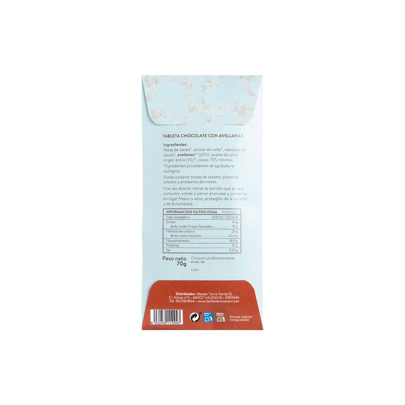 Chocolate Negro 75% Vegano con Avellanas 70g Bio cesta