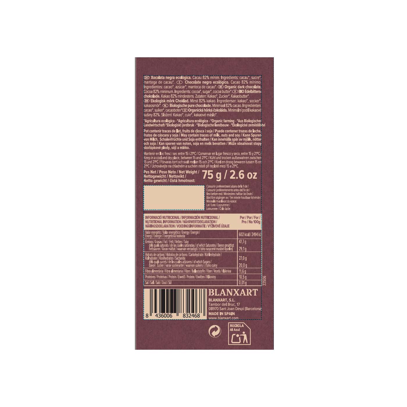 Chocolate Negro 82% Congo 75g Blanxart