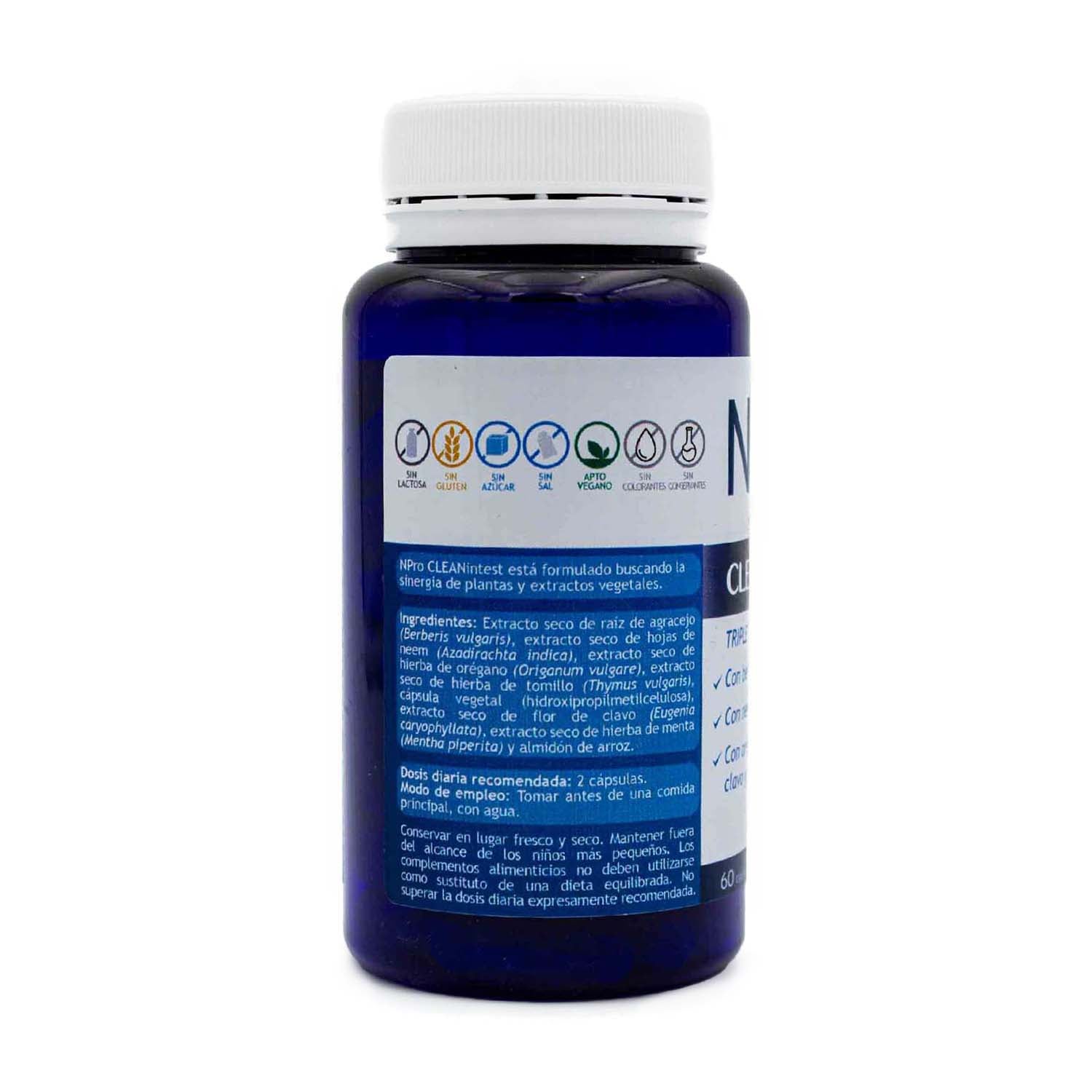 Cleanintest de NPro es un producto que se presenta como un complemento alimenticio que se compone de plantas y extractos vegetales para dar apoyo al mantenimiento normal del intestino. Destacan entre sus principales ingredientes Neem, Berberina, Orégano y Clavo. NPro presenta este complemento alimenticio frente a diferentes tipos de infecciones intestinales, como bacteriosis, candidiasis y parasitosis.