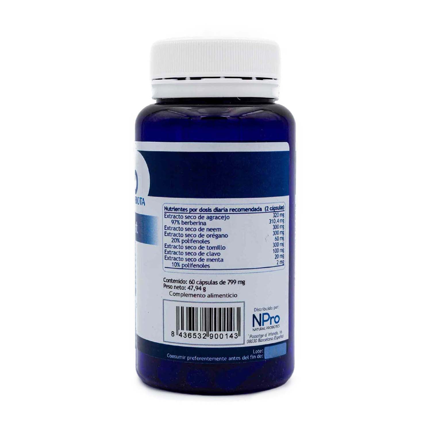 Por dosis diaria (2 cápsulas): Extracto seco de agracejo 320 mg, 97% berberina 310,4 mg, Extracto seco de neem 300 mg, Extracto seco de orégano 300 mg, 20% polifenoles 60 mg, Extracto seco de tomillo 300 mg, Extracto seco de clavo 100 mg, Extracto seco de menta 20 mg, 10% polifenoles 2 mg. Sin Gluten, Sin Lactosa, Apto vegano, Sin excipientes químicos (dioxido de silicio, estearato de magnesio), Sin GMO.